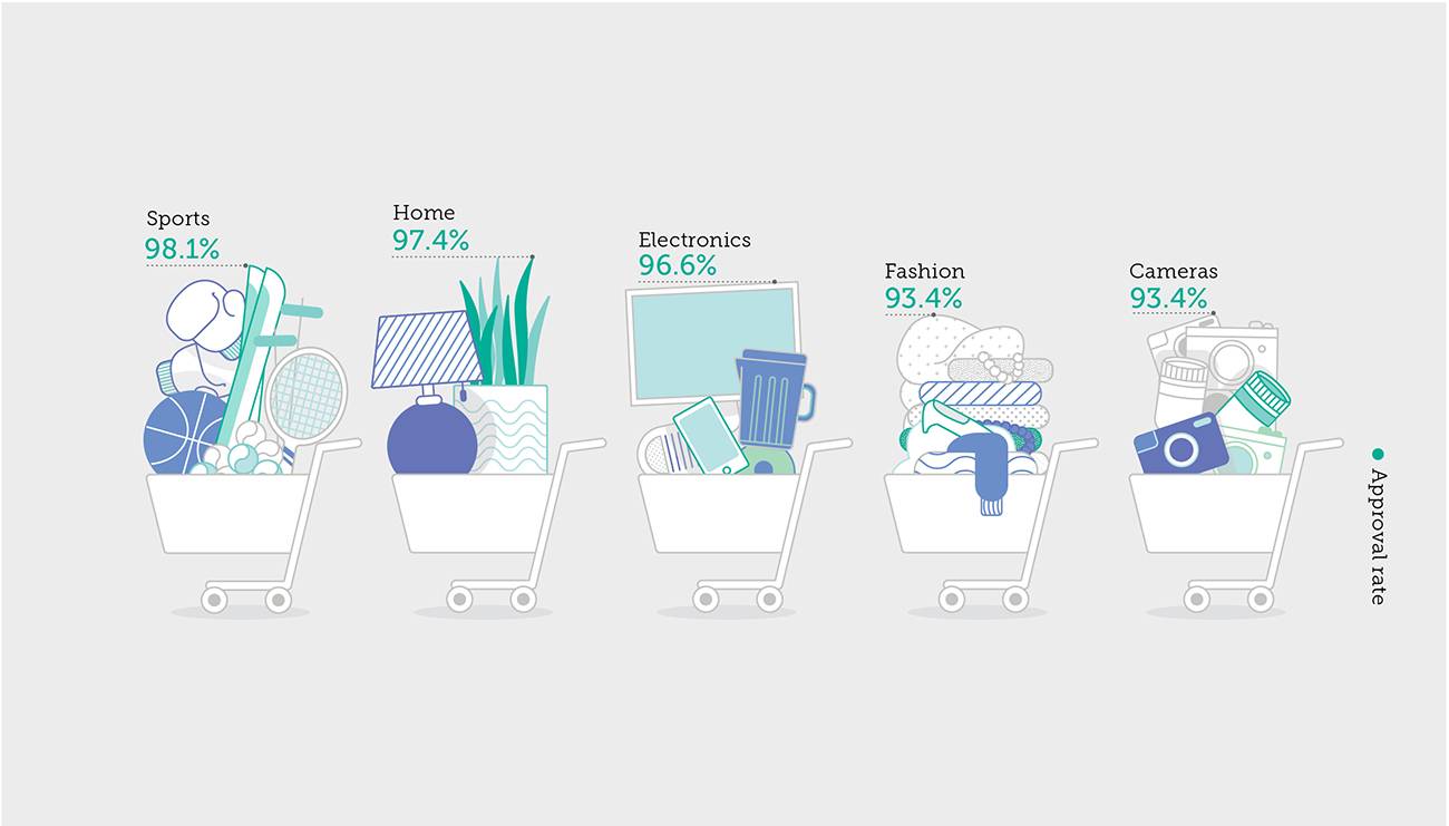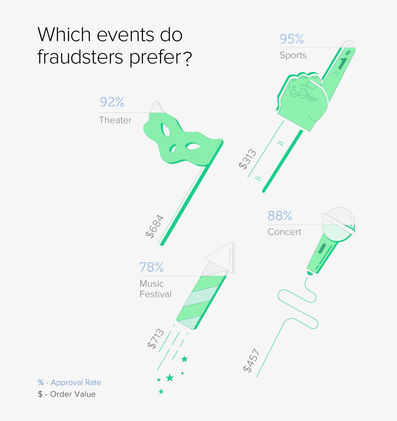 זו שאלה מעולה. אנחנו בודקים את זה – בדרך כלל יש מתאם גדול בין פופולריות ומחיר להונאות. בכל תעשייה יש הבדלים בין אחוזי ההונאות – אחד האתגרים שלנו כמעצבים זה להנגיש את המידע הזה באופן שהוא גם מושך וגם קל להבנה. דוגמה שאני מחבבת במיוחד היא על הונאות בתעשיית הכרטיסים ואירועים: אפשר לראות בדוגמה איזה אחוז מהעסקאות הן מדד ה״safe״ של העסקה לפי סוגים של אירועים שונים. יש יותר עסקאות בטוחות באירועי ספורט מבפסטיבלי מוזיקה. בנוסף אפשר לראות שהמחיר הממוצע באירועי ספורט נמוך יותר משל פסטיבלים של מוזיקה – כך שאפשר להסיק שיש קשר בין מחיר הכרטיס לביצוע ההונאה