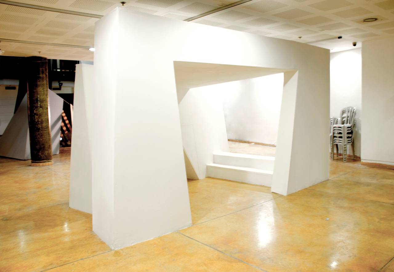 ״פיינטבול״, לדוגמה, עוצב כמבנה בתצורת משולש, שמסתיר וחושף בעת ובעונה אחת ומשלב גבס ועץ. הגבס משמש בחלקו האטום, והעץ, שמופיע כעמודים אלכסוניים, מנתב את התנועה בכניסה וביציאה שכמו ״נמהלות״ זו בזו.