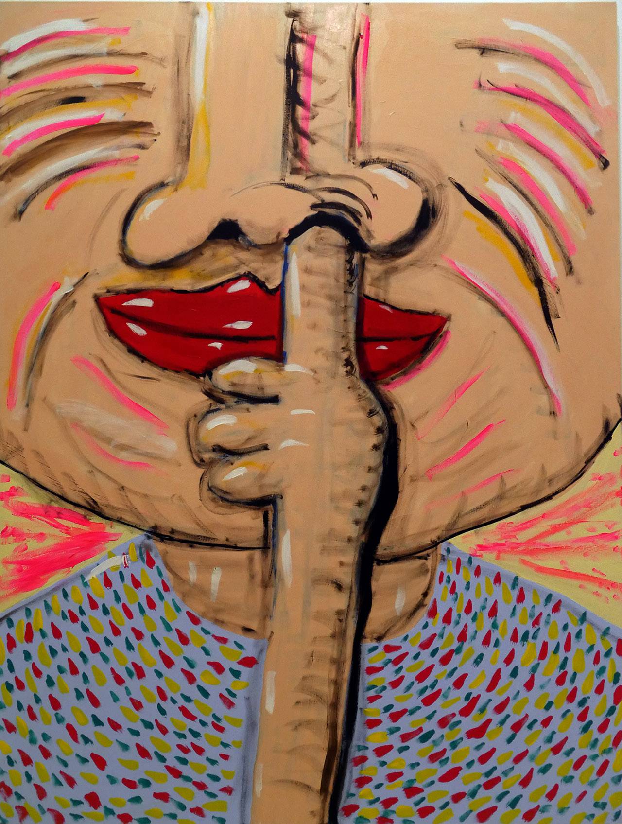 הייתי רוצה שהתערוכה תבלע אותם. לא נעים אולי לומר, אבל הרבה פעמים מה שאני מחפש בעבודות שלי זו יצירה של איזו תחושה של אי נוחות מסויימת. אני עושה מהלך כפול של משיכה ודחייה: הציורים שלי מאוד צבעוניים ומזמינים, אבל באותו זמן גם גדושים מדי מבחינת הצבע והקומפוזיציה ויכולים לגרום לדחייה מסויימת. זה שוב מחזיר אותנו לגוף, לאיזושהי תחושה של אי נוחות