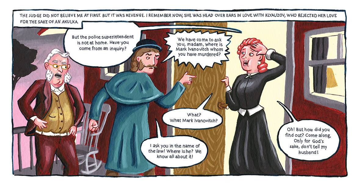 הוצאת Seven Stories Press התכוונה להוציא אנתולוגיית פשע, ופנתה אל חברי האמדראם והזמינה סיפורי קומיקס שעוסקים בפשעים. ככה הגעתי לסיפור המעולה של צ׳כוב ועשיתי לו עיבוד קומיקס. זה סיפור שקורה בברית המועצות של סוף המאה ה־19, ומלווה שני חוקרים שמנסים להתחקות אחר רוצח של לורד מקומי. זה סיפור מאוד ססגוני, שכולל בין השאר פרשיות ניאוף, תרנגולות כרותות ראש והרבה וודקה.