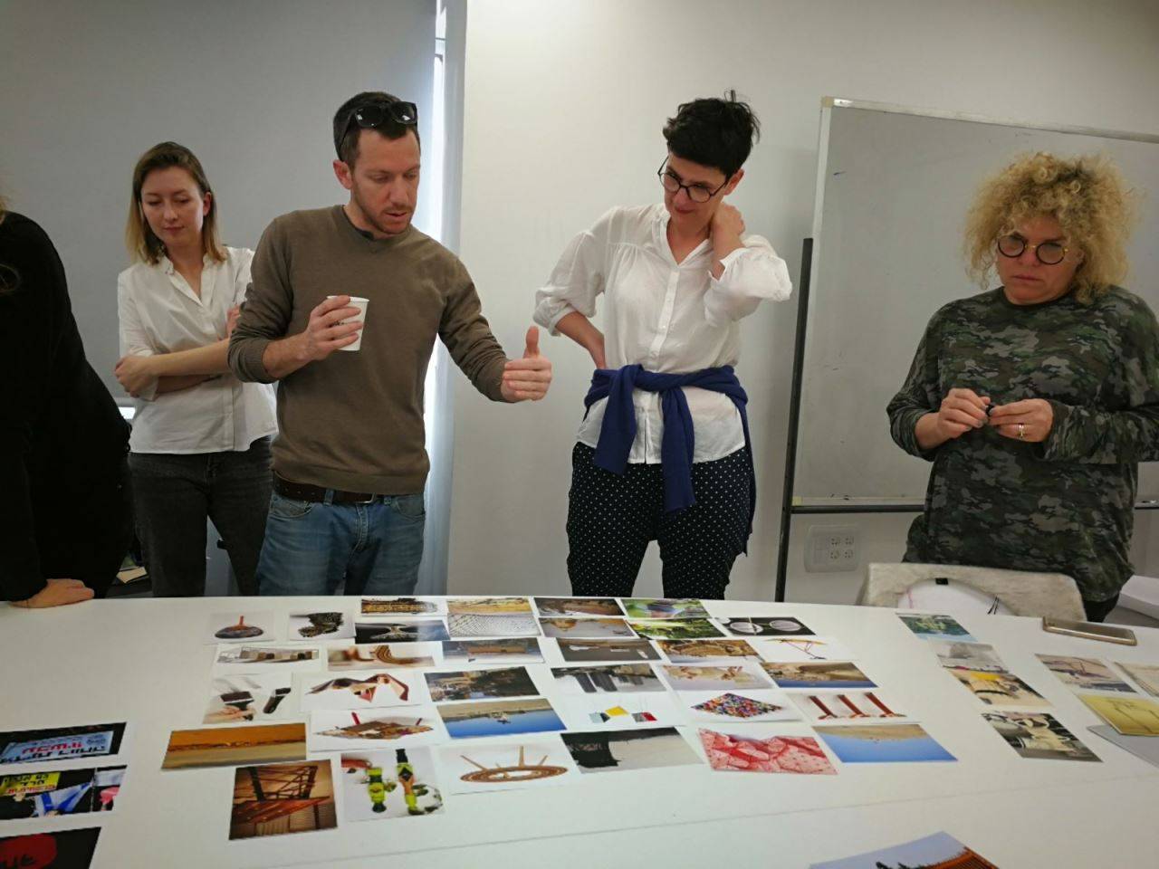 אגניישקה יקובסון (במרכז התמונה) בסדנה בשנקר עם גלית גאון ותלמידי התוכנית לאוצרות בעיצוב