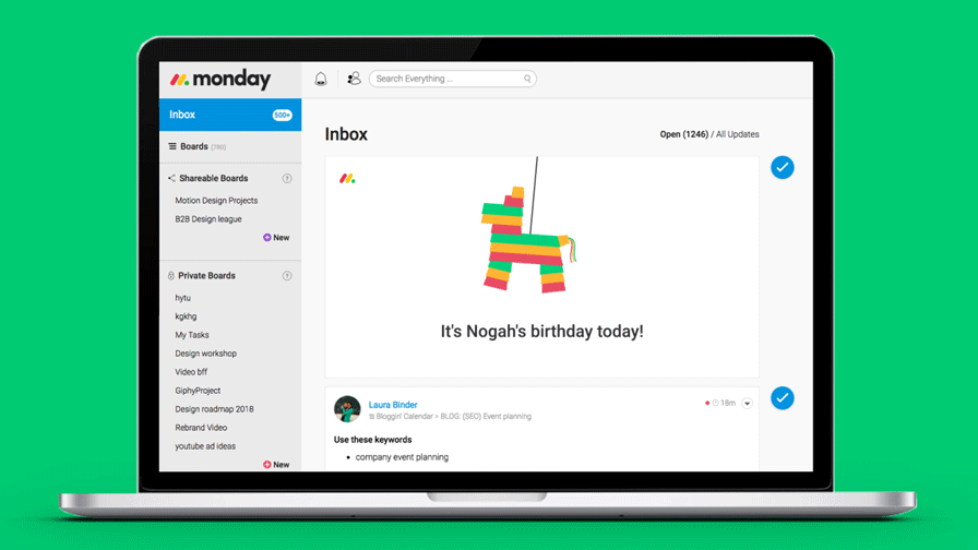 אחד הדברים שמאפיינים את העולם הדיגיטלי הוא המרדף הסיזיפי והאין־סופי אחרי ״אינבוקס אפס״: אותו תרחיש דמיוני שבו לא ממתינים יותר מיילים בתיבה שצריך לטפל בהם. המקבילה לכך במערכת של monday.com היא שורת המשימות שמחכה למשתמשים שלה בתחילת השבוע, ושמזמנם להם את האתגר להשלים אותן, ובמילים אחרות: לצבוע אותן בירוק.