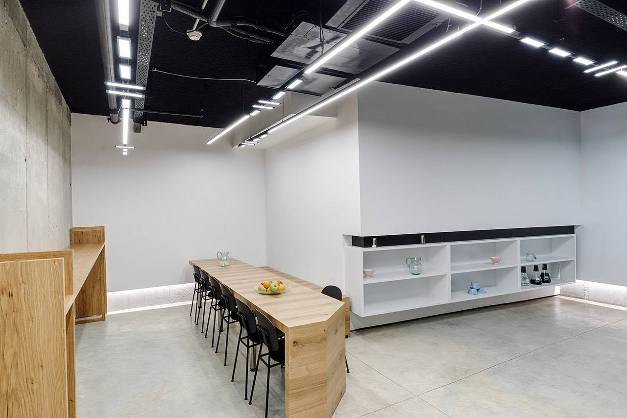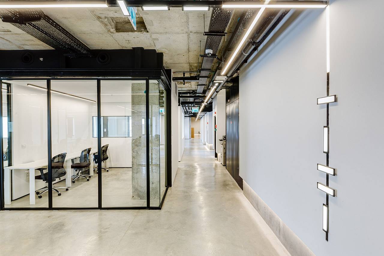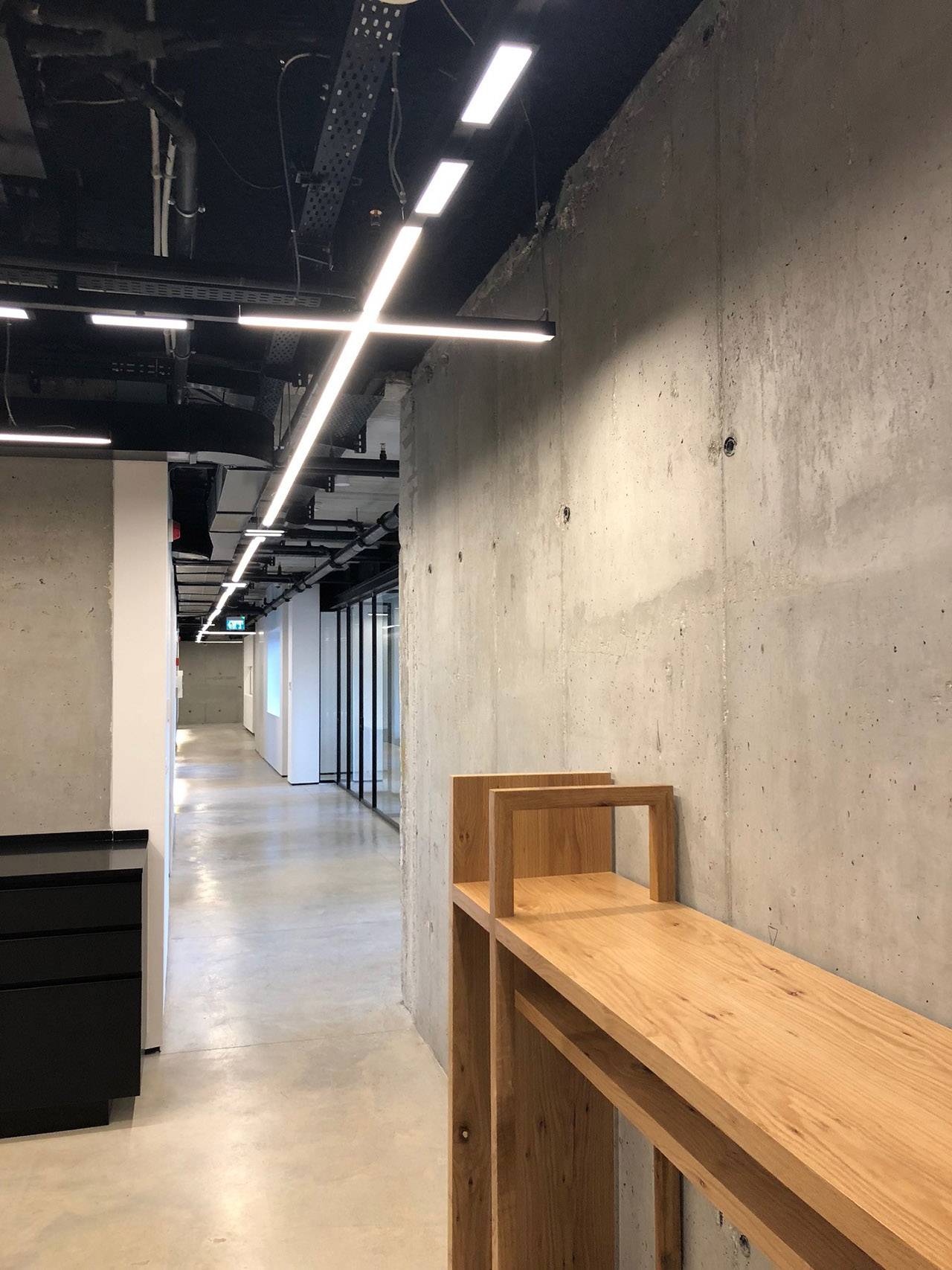 נכון. עיצבנו ספסלים מעץ אלון (240 ס״מ אורך) וספת ישיבה גדולה (340 ס״מ). האדריכלים עבדו עם בטון, עץ וברזל שחור. החלל מאוד מינימליסטי ונקי. הספסלים עומדים לאורך המסדרון הרחב, ומהווים סוג של קשר בין שני צידי המסדרון. לגבי הספה שאותה ביקש במיוחד המנכ״ל – מדובר בספת ישיבה אלטרנטיבית סגולה מפני שמיתוג החברה הוא סגול. גם במקרה הזה יצרנו הרבה קונספטים, ובסופו של דבר החברה בחרה ברעיון של שלושה עיגולים שמתנתקים ונכנסים אחד לשני