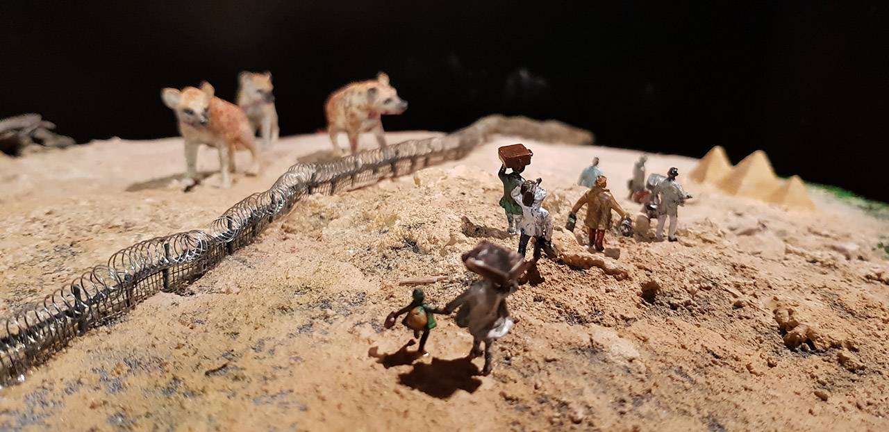 זה בדיוק מה שרציתי לשאול: אם תוכל לתת דוגמה ספציפית. אבל אמרת מקודם שכל אחת מהדיורמות מבוססת על תמונה מוכרת מסיפור או אירוע הפליטים בישראל. איך זה קשור?