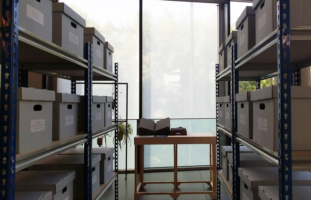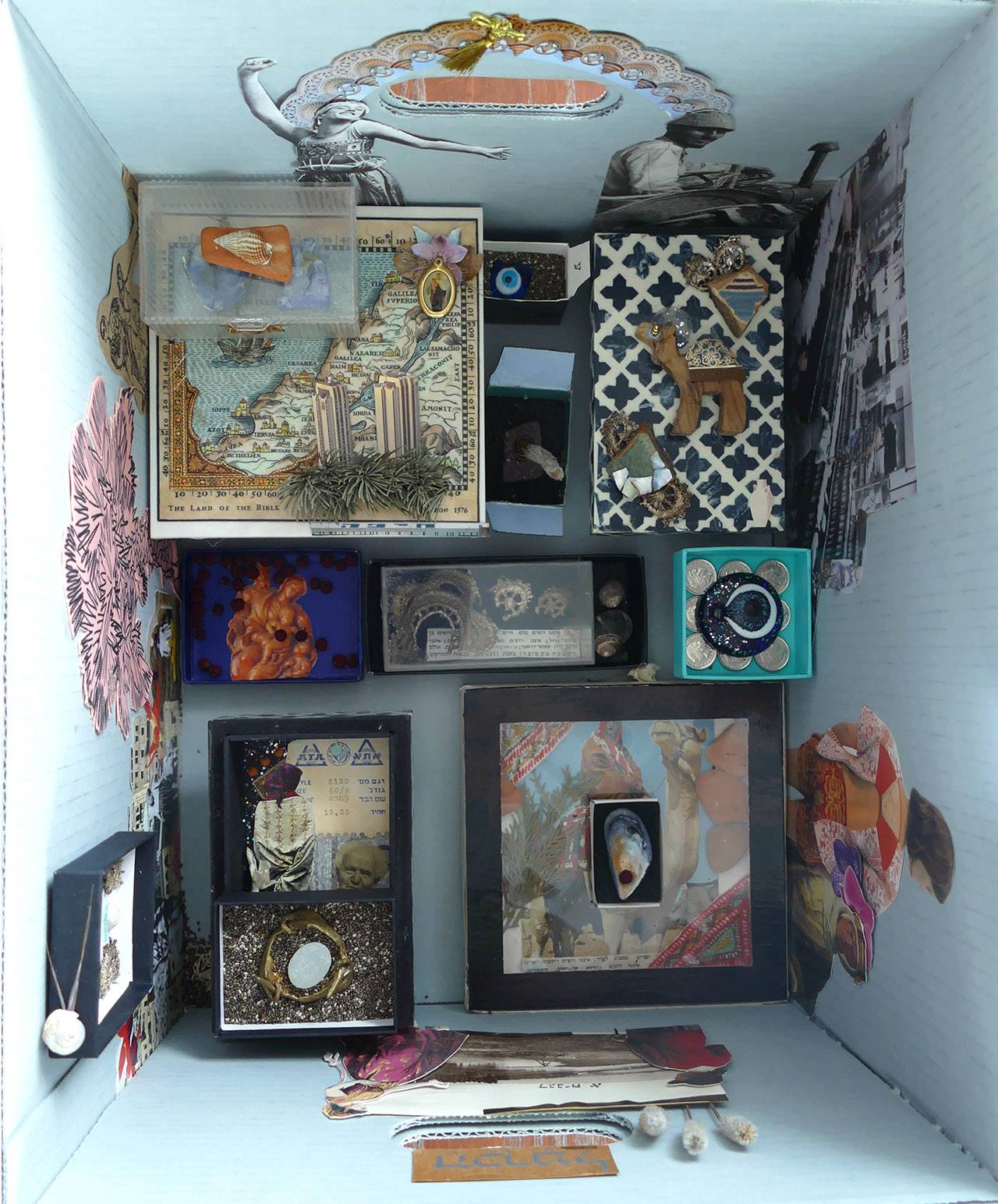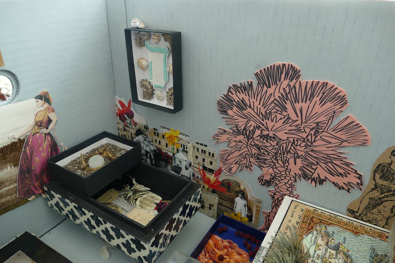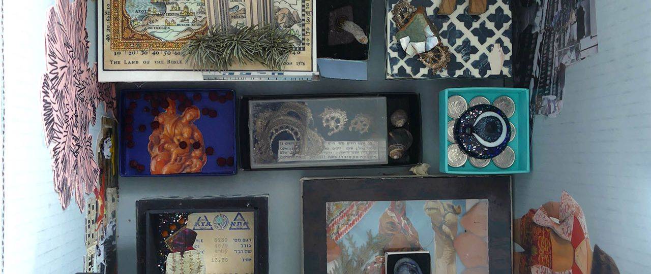 במהלך הלימודים ניתנו לי הזדמנויות שונות ומגוונות להתנסות גם באוצרות וגם ביצירה, המתכתבות עם הנושאים שבהם עסקנו בקורסים השונים. בתערוכת הסיום הקמנו מיצג משותף – ארכיון כיתתי שהמבקרים יכלו להסתובב בו ולשלוף קופסאות שכל סטודנט יצר בעצמו. אני בניתי קולאז׳ תלת־ממדי – מעין ארכיון חומרי שהתבסס על חווית השיטוט בארכיונים הישראליים השונים, שמכיל דברים שיוצרו ונאספו בארץ.