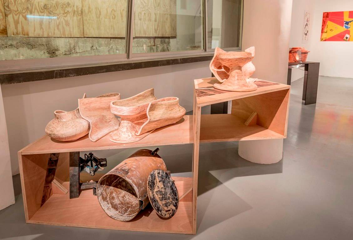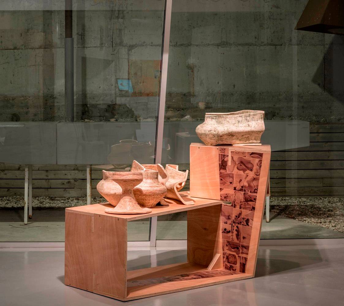 בין עבודות החמר מוצגים בתערוכה גם הקנקן מאתר ע׳סול ומכונת השיחול, ולצדן עבודות שעשויות מחומרים ״ממושמעים״ יותר, כ־MDF ופרספקס, שמשתלבים זה עם זה בגופים שנוצרים בתהליך המערב תכנון ממוחשב. ״התכנון הפרמטרי מאפשר ליצור על בסיס חתך כלשהו גופים תלת־ממדיים, לשלוט בתהליך ולדייק את הבנייה ואת המופע שלהם״, אומר קרמסקי. ״במעבר מהתהליך הפרמטרי למבנה שהוא חומרי, החתכים, שמעובדים מחתכים אורכיים לחתכי רוחב, ׳מפורקים׳ לפרוסות חומר/חומרים ונפחי הגופים נבנים בשכבות.