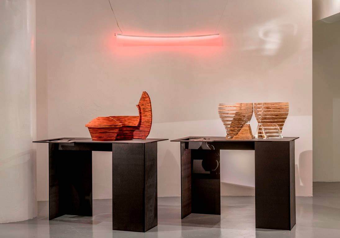 ״הרצף השכבתי מייצר את השלמות ואת המראה השלם שלהם, ובכל נקודה שבה יבוצע בהם חיתוך החתך יהיה זהה. הגופים האלה לא היו יכולים להיווצר ללא התכנון הממוחשב״. בתערוכה מוצבים הגופים על שולחנות מעוצבים שקרמסקי יצר ייעודית בהתאמה להם: בעבור גופי החמר שולחנות עשויים דיקט שעליו מודבקים אימג׳ים מתהליך העבודה, ובעבור הגופים המורכבים שולחנות מלוחות MDF שחורים עם הטבעת חתכים שמדמים סימנים ארכיאולוגיים על פני שטחם.
