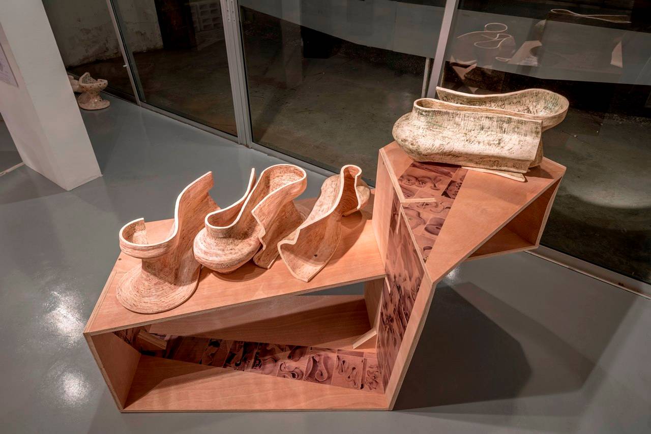 ״בנינו מכונת שיחול, שאפשרה למשוך את החתך המקורי לאורך, כך שהוא ׳מתהפך׳ וחוזר אל עצמו תוך יצירת גוף חדש ואחר, שאותו חיברנו עם חלקים שבוצעו בעבודת אובניים. להבדיל מעבודת האובניים שמניבה אוביקט מדויק, בתהליך ׳משיכת׳ החתך נדרש פיסול ידני, ומכיוון שהחמר לא ניתן לשליטה מוחלטת אפשר רק להתוות כיוון אבל לא ׳להבטיח׳ את התוצר הסופי. החמר ככלל מרתק באפשרויות שהוא מזמן ובשיטות העבודה המגוונות שמניבות תוצרים משתנים״.