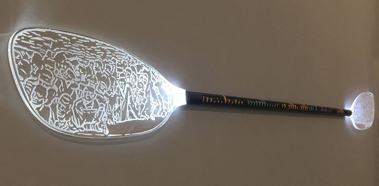 העבודה ״משוט״ נוצרה בעבור התערוכה ״אוביקט מעבר״. ראיתי חיבור חזק בין מה שהמשוט מסמל בעבורי לבין מה שהמשוט משמש בעבור הפליטים: אוביקט שמעביר ממקום למקום. על כנפי המשוט השקופות, סמל לשקיפותם של הפליטים, צרוב צילום עיתונות של פליטים המצטופפים על סירת גומי. על גוף המשוט מופיעים הנתונים של מספר הפליטים שטבעו בים בכל חודש בחמש השנים האחרונות.