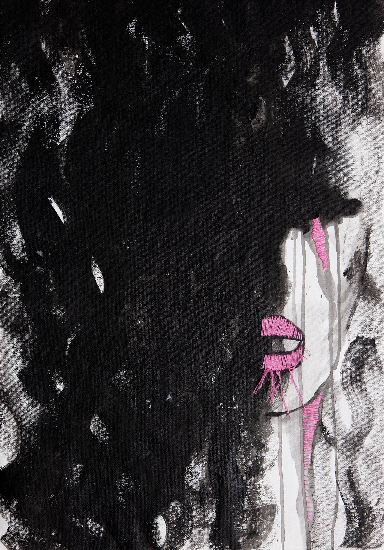 אם בתערוכה הקודמת היה קיר אחד עם עשרה ציורים צבעוניים, הפעם יהיו הרבה יותר. התחלתי להוסיף צבע ברקמה על הקנבס, חוטי רקמה צבעוניים על האקריליק השחור… פתאום השחור נראה לי זקוק לצבע עליז יותר. הוספתי אותו בסוף העבודה לפי תחושת בטן. הוספתי דפי זהב דקיקים, וגם התחלתי לעבוד על קנבסים ענקיים (1.10־2.20 ס״מ) באקריליק ובמשיכות מברשת גדולה עם כל הגוף
