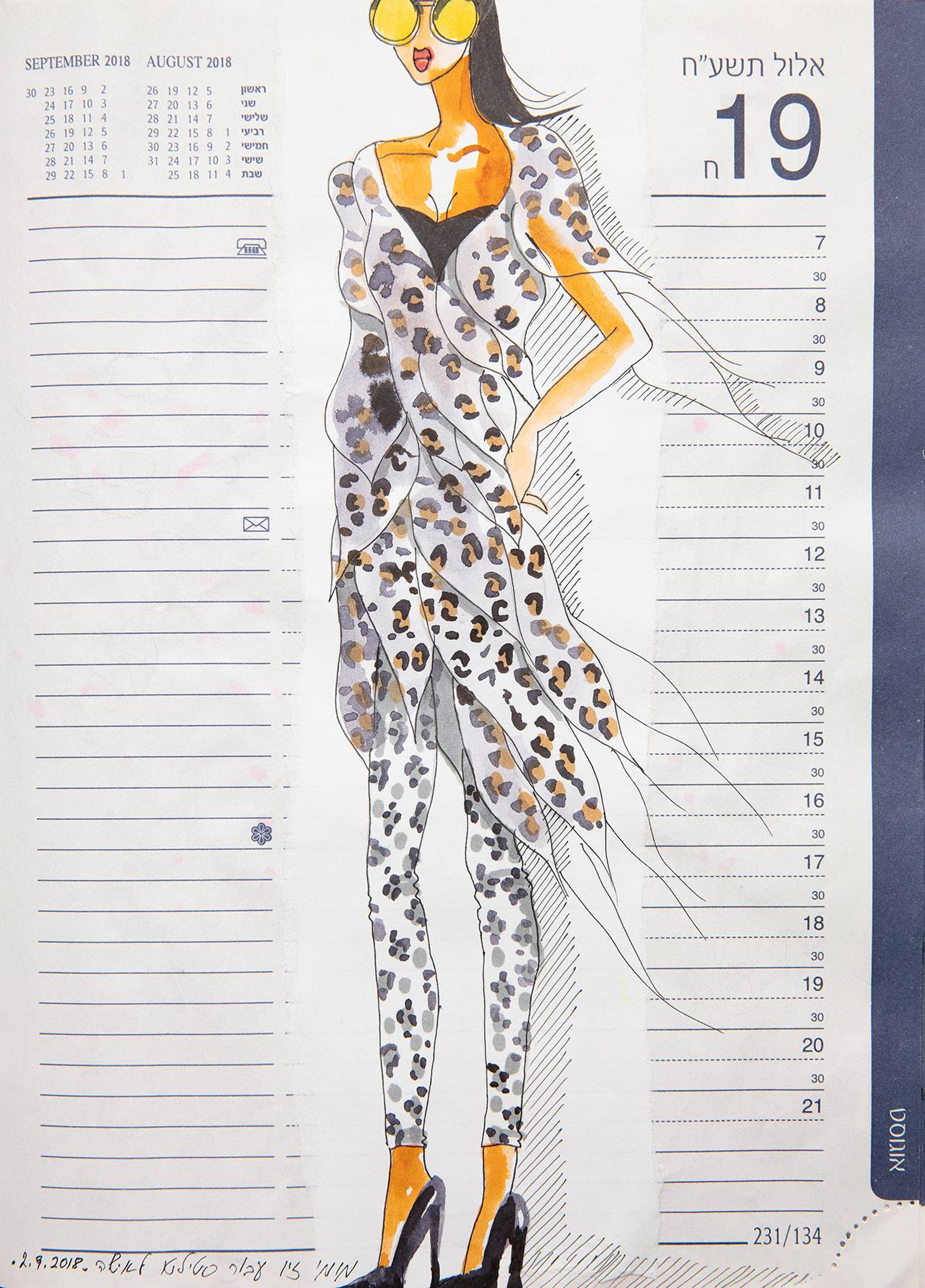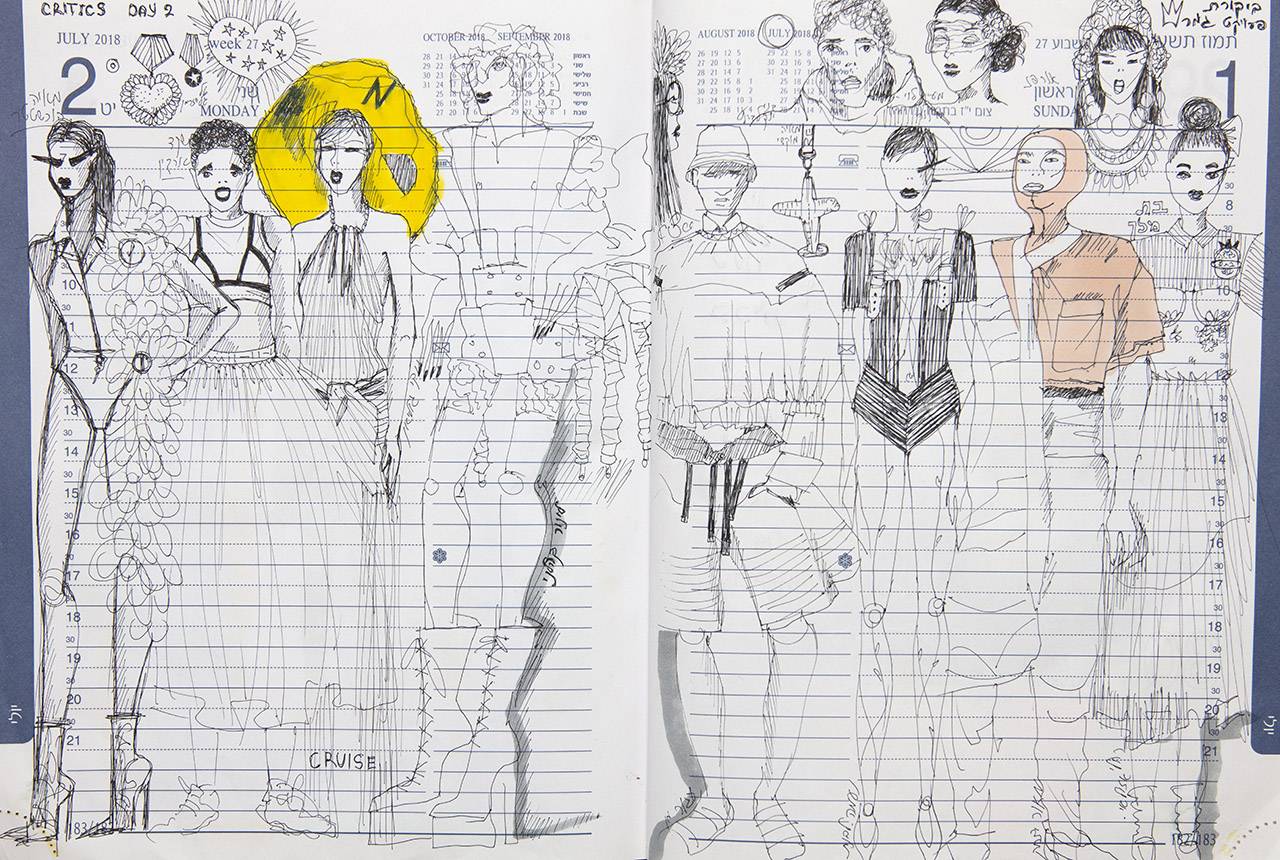 עם כל זה שאני מאוד דיגיטלית אני עדיין בעד ציור ביד! תמיד יש לי ספר סקיצות בתיק, גם בנסיעות לחו״ל. בחודש ינואר לפני שנה קניתי יומן משרדי גדול בגודל A4 ופשוט התחלתי לצייר בו כל יום – אני מציירת ביד ימין, מסריטה ביד שמאל ומעלה לאינסטגרם. אימון טוב ליד ותרפיה נהדרת לנשמה. שם גם ציירתי את הסקיצות לציורים לתערוכה. נוסף על כך תיעדתי כל דבר שקרה לי בחיי היום־יום ביומן: הדבקתי,כתבתי וכו׳. כל היומן יפורק, ויהיה תלוי דף דף בתערוכה