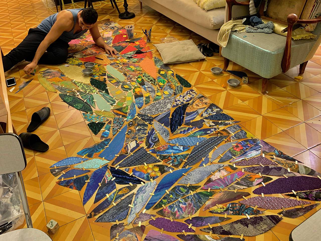 יהיו אוביקטים חדשים שפיתחתי במיוחד לתערוכה, אני קורא להם ״תכשיטי חלל״, יריעות ענקיות שיוצרות דיאלוג בין שנינו, בין סבא שלי לביני. מבחינת חומרים הם יהיו מורכבים מחלקי ציורים שלו, שחתכתי ושילבתי מחדש עם חתיכות של בדים שאני מייבא מעולם אופנת העילית של פריז, ומה שמחבר ביניהם הן חתיכות מתכת שיצרתי במיוחד.
