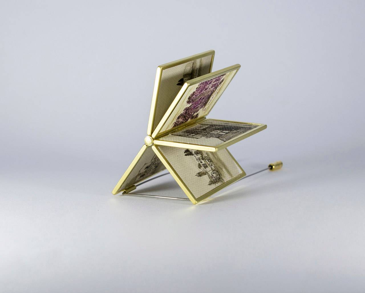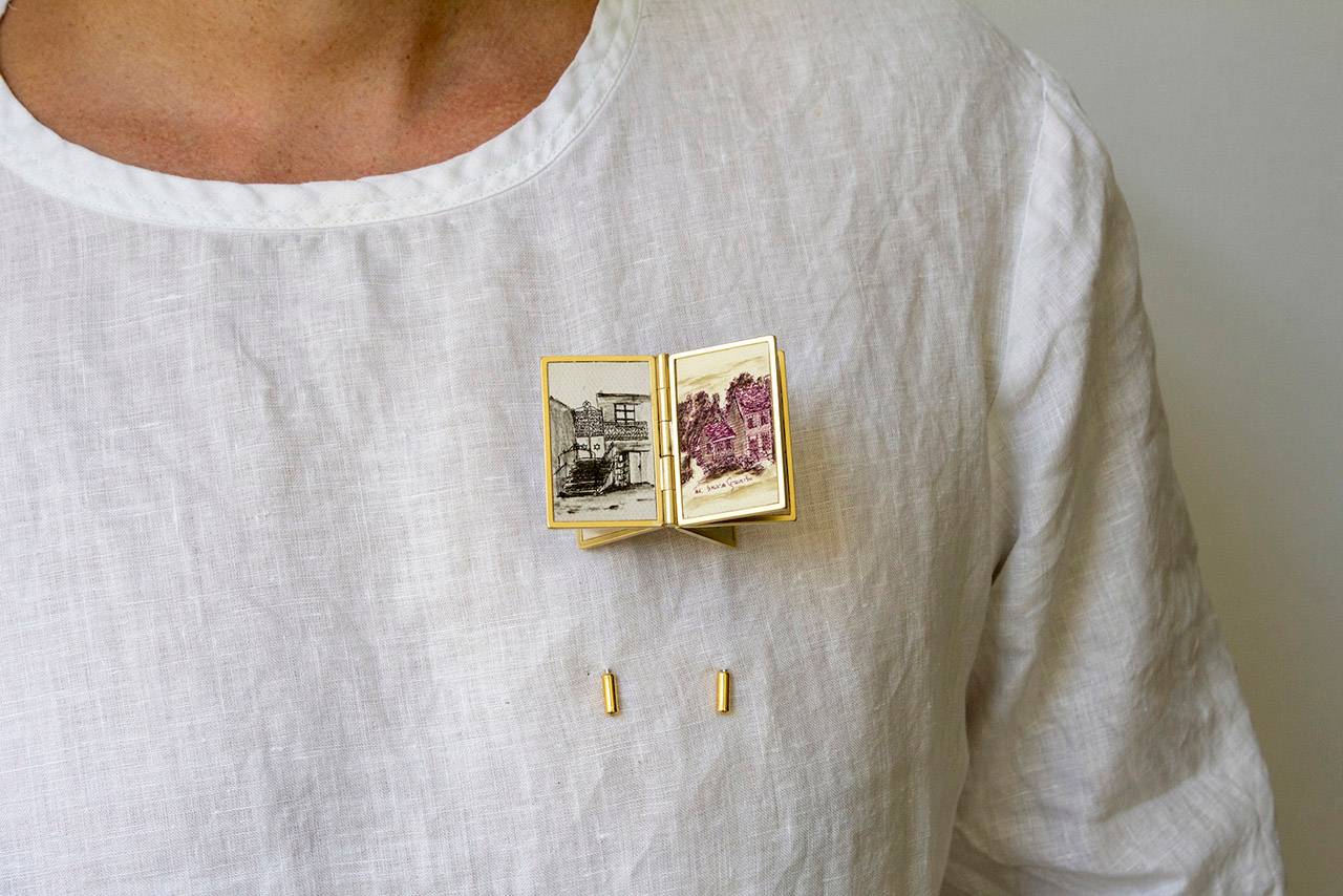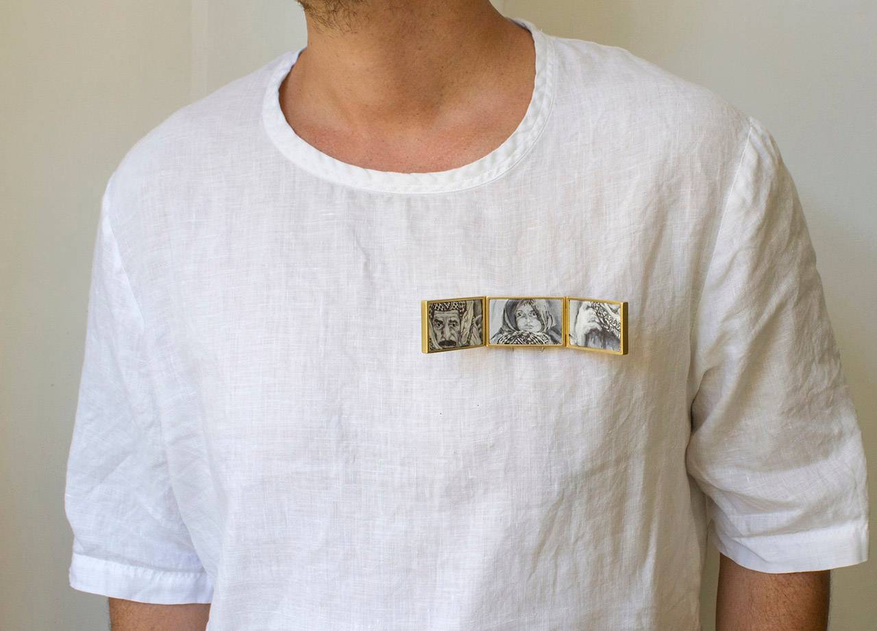 בנוסף אציג סדרת סיכות, שבהן לקחתי את הציורים של סבא שלי, בחלקם התערבתי ואת חלקם שימרתי בשלמותם, הקטנתי ושיבצתי בקונסטרוקציה שהלחמתי/צרפתי בהשראת הציור שלו שבחרתי לאצור על הגוף (ותהיה גם סדרה של תכשיטים שמשלבים בין מתכות לבדים)