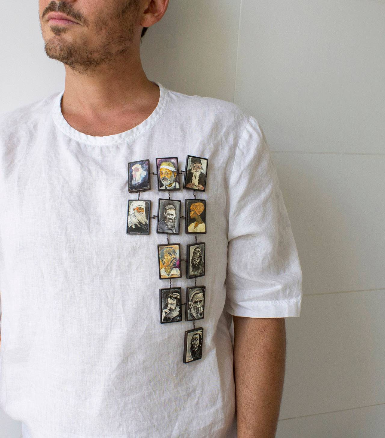 הפעם, אי אלו שנים אחרי, אני עושה פעולה דומה אבל פחות ״אלימה״, ממקום יותר שלם ומכיל. הפעם זה לא הציורים עצמם אלא הדפסים/העתקים שלהם. אני נושא אותו על גופי, משבץ אותו בתוך סיכה, בוחר את הנושא, את דרך הפרזנטציה, משלב את יצירתו ביצירתי