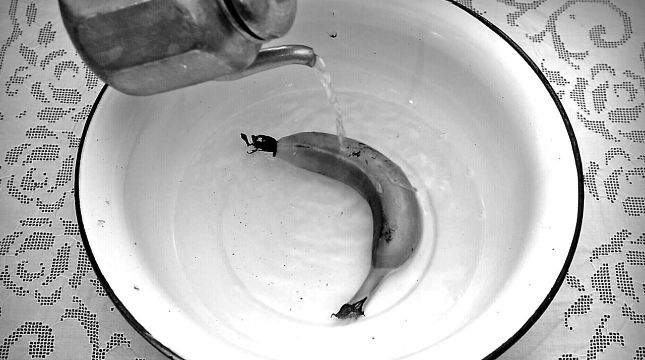 העבודה מוצגת בחלון הפונה לרחוב ומציגה פן אחר בנושא ההיגיינה. מקור ההשראה לעבודה הוא משפט שאמר אבי: ״סבתא שלך הייתה שוטפת אפילו את הבננות במים רותחים״. בעבודה נראית הפעולה בלופ והבננה משחירה מיידית בגלל השטיפה במים רותחים. האובססיה לניקיון שמתאר אבי תואמת את המציאות התקופתית שעולה ממסמך ארכיוני שמצאתי בעיריית תל אביב, האוסר על רוכלים המוכרים בננות למכור ברחבי תל אביב כי הם אנשים מזוהמים אשר אינם תושבי העיר. המסמך מוצג בחלל הכניסה של הגלריה ויוצר קשר מהופך בין פנים לחוץ.