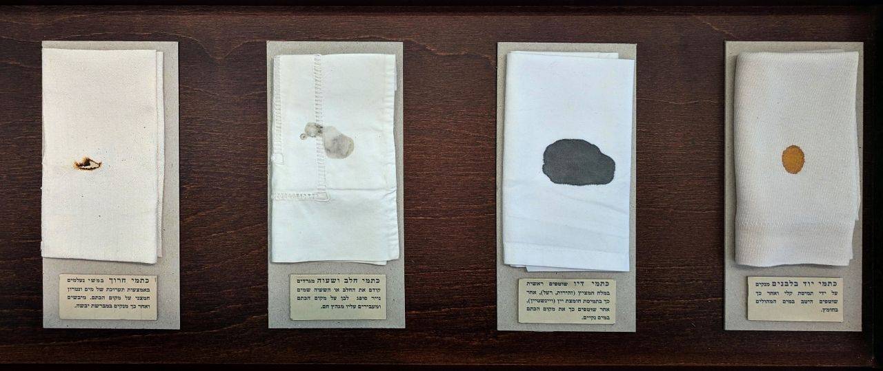 בגלריה הצבתי שולחן תצוגה ארכיוני ובו מוצגות פיסות בדים ועליהם סוגי הכתמים השונים, והנחיות להסרתם. שולחן התצוגה מקבל את פני הבאים לגלריה ומשמש כמקרא לכלל ההתרחשות בתערוכה. חדר הכניסה מדמה מוזיאון תקופתי ומשמש מעבר לשני החדרים הנוספים, שבהם מוצגות עבודות וידאו העוסקות בקשרים בין אמהות ובנות, ניקיון, אובססיה, והיסטוריה מקומית.