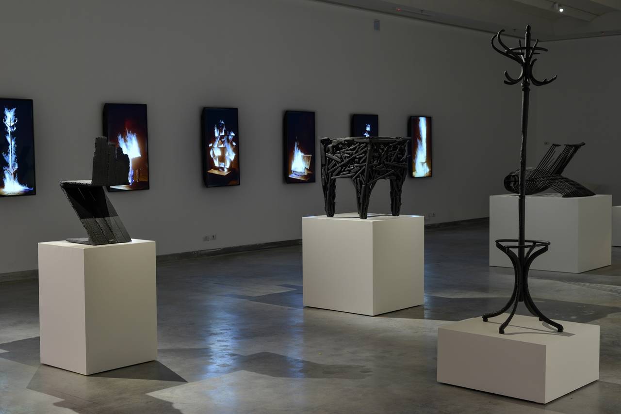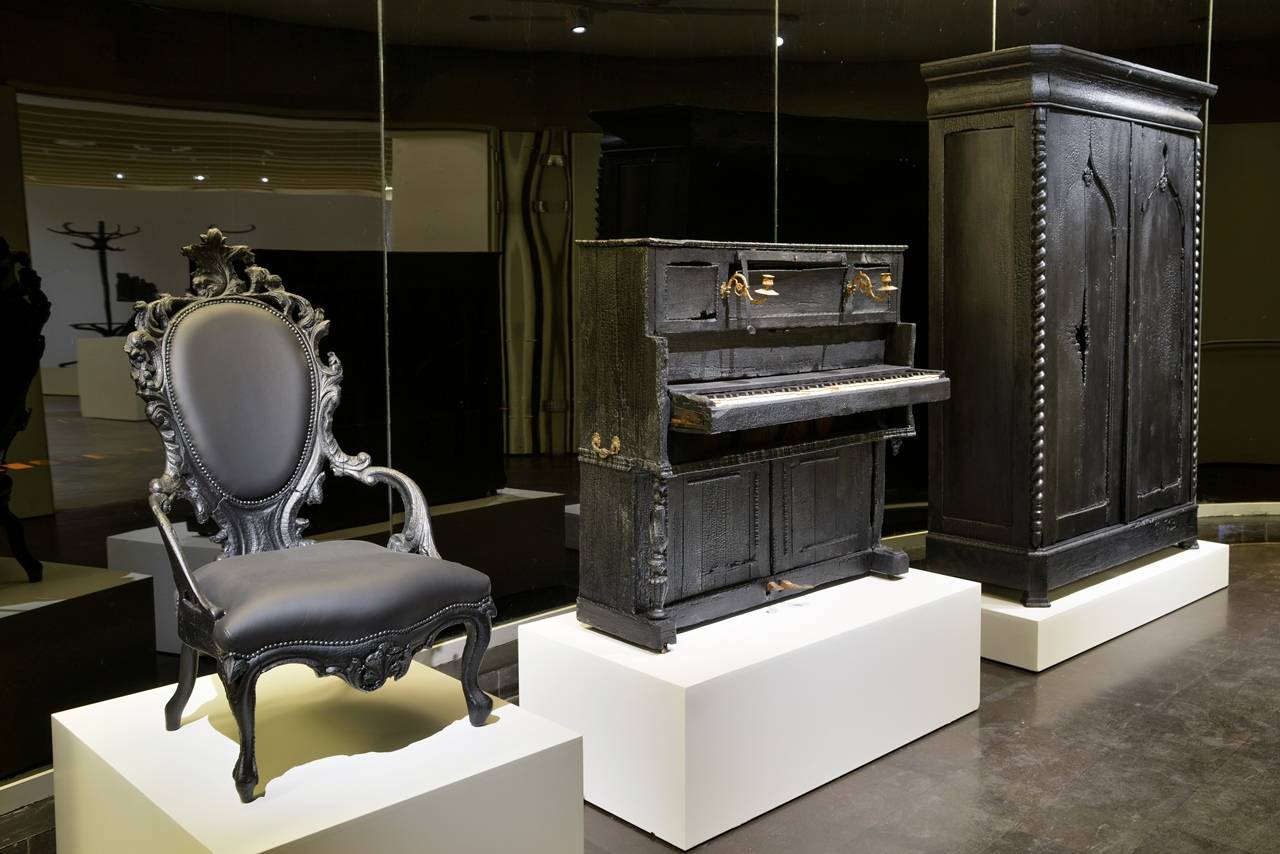 סדרת רהיטי המעצבים השרופים שמוצגת בתערוכה מחבואים במוזיאון העיצוב חולון, יכולה לשמש מעין תקציר להיסטוריה של העיצוב: מנורה ניצבת טליסיין III בעיצוב פרנק לויד רייט; כיסא זיג־זג, שעיצב חריט ריטפלד בסגנון המודרניסטי של התנועה ההולנדית דה סטיל; וכוננית הספרים ״קרלטון״ שעיצב אטורה סוטסאס, כחלק מסדרת הרהיטים הראשונה של קבוצת העיצוב ״ממפיס מילאנו״, משנות ה־80, שעיצוביה נתפסו כתגובת נגד לעקרון הפשטות של תנועות הבאוהאוס, דה סטיל ודומותיהן.