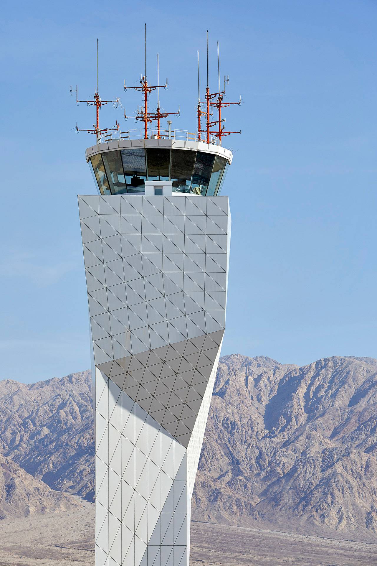 מבנה הטרמינל מורכב מקונסטרוקציית פלדה ובטון המחופה בפנלים של אלומיניום צבוע בלבן בוהק עם שילוב שכבות בידוד תרמי ואקוסטי, כשאופן הקימוט כלפי חוץ מצטט את צורניות הסלעים ומייצר הצללה למבנה. מערכת הגג, החזית החמישית, תוכננה מתוך מחשבה על המבט שמתקבל מהאוויר: תשתית הניקוז משתלבת מתחת לחיפוי האלומיניום שאינו אטום לחלוטין, כך שהגג נותר ״נקי״ והנרטיב העיצובי נחשף גם במבט עילי. התשתיות הפונקציונליות של מגדל הפיקוח נוצקו בבטון שנעטף בקונסטרוקציית פלדה קלה ובחיפוי מקומט זהה המחבר אותו לשפת המקום, ומערכות התמך רוכזו מתחת סככות ענק. המבנים תחתיהן תוכננו בקווים נקיים, ועיצוב הסככות המצלות עליהם מגלם המשכיות לשפת העיצוב ומדמה מעין שמיכות שמרחפות ברוח.