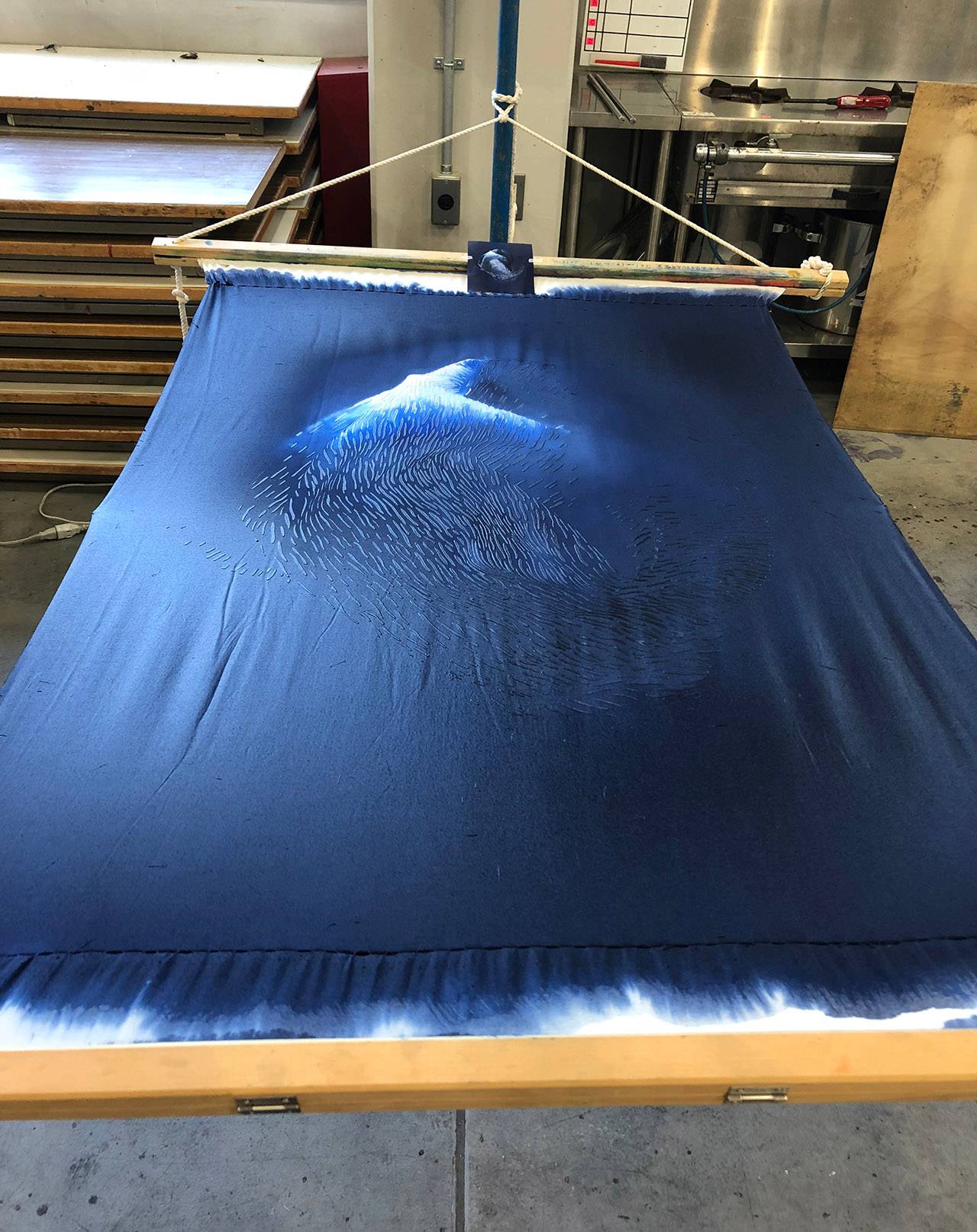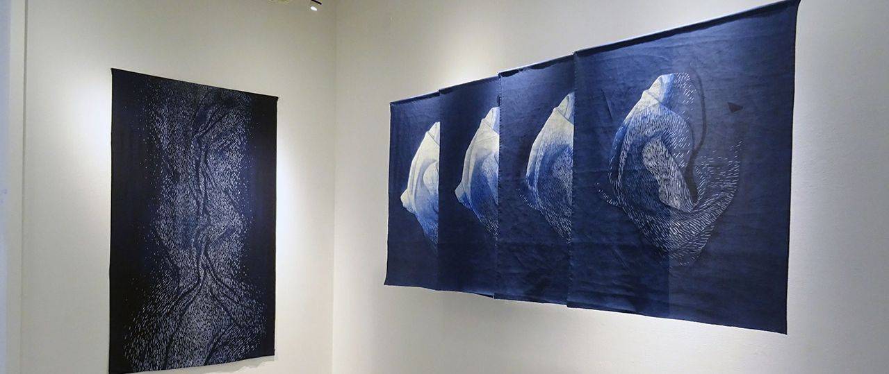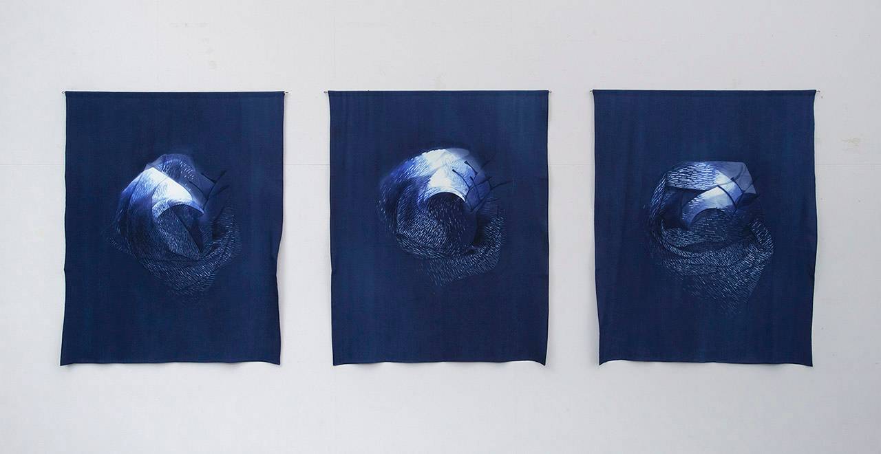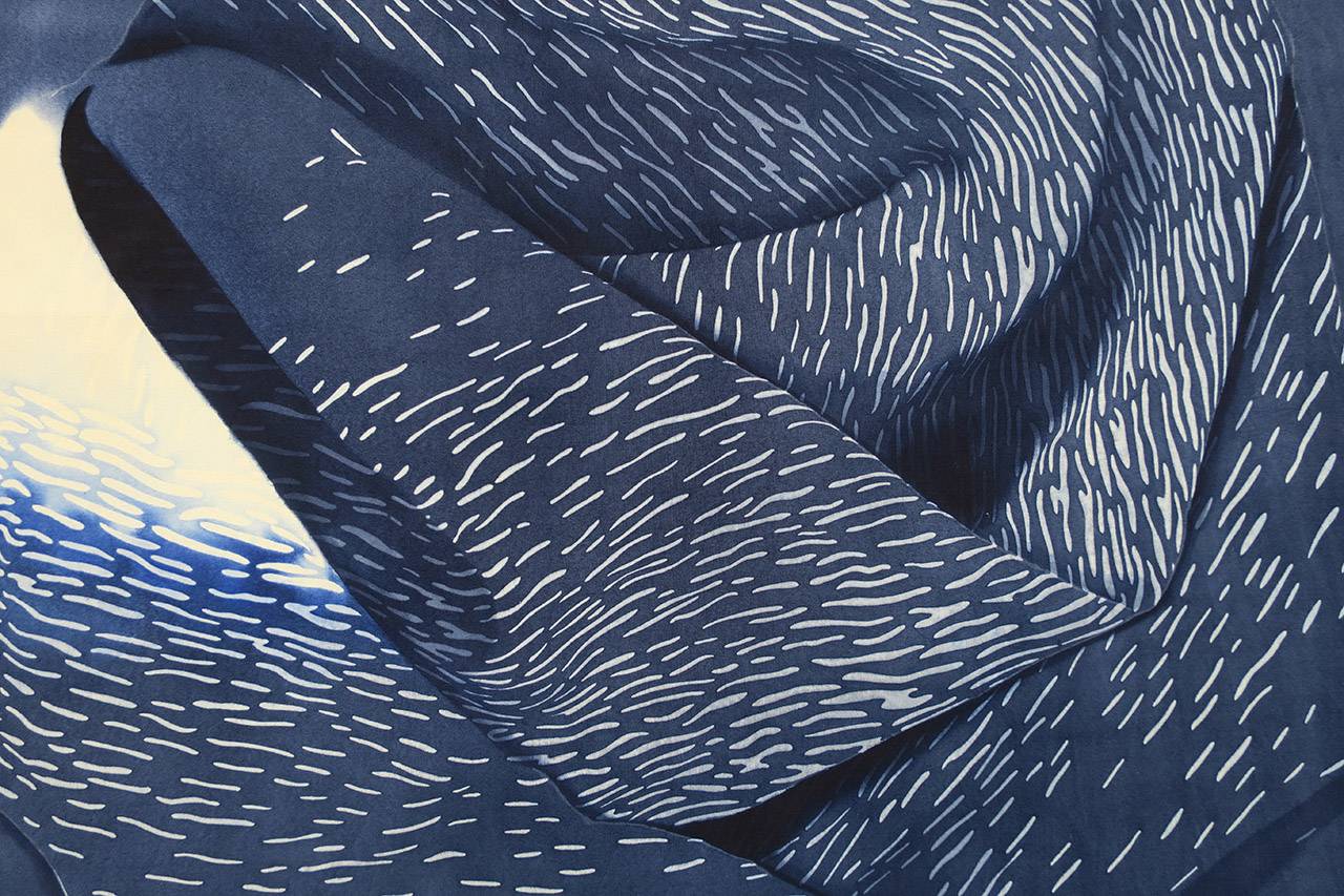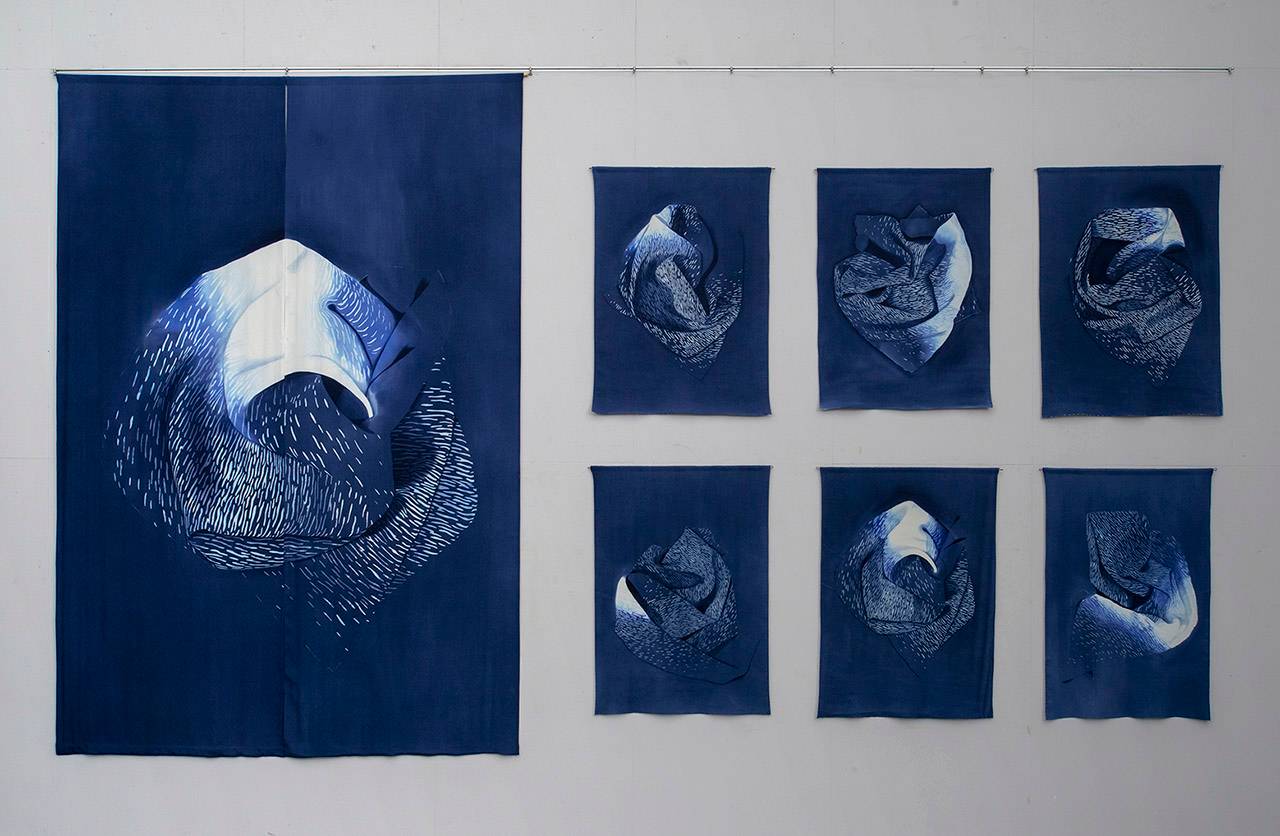 מקבץ העבודות שמוצגות הוא ביטוי להתפתחות של המחקר שלי מהשנה הראשונה, שהתעסק במוטיב של מים, מוטיב שאני חוזרת להתעסק בו שוב ושוב. הסתכלות על המים כביטוי למשהו שחוזר על עצמו אבל משתנה כל הזמן. עניין אותי לחקור מה קורה לפאטרן כשאני מקפלת את הבד. התחלתי לשחק עם התנועה של הבד מתוך מחשבה על זרימה ותנועה של המים, וגם על הקונספט של השינוי עצמו. הקיפול הופך את הפאטרן הדו־ממדי לתלת־ממדי ואני מחזירה אותו חזרה להדפס דו־ממד. השתמשתי גם באזור הלבן, האזור שנשאר לא צבוע, כנקודת מוצא למחשבות על זמן וחלל