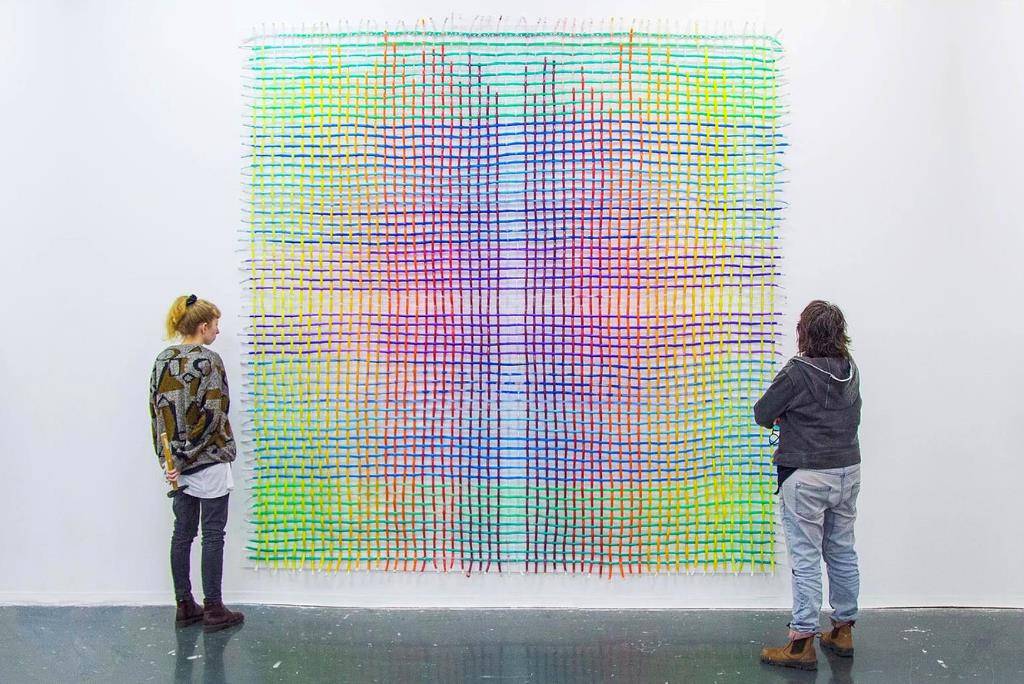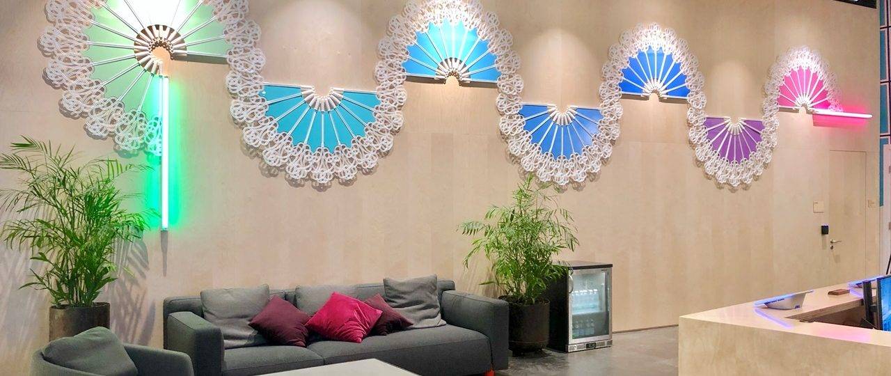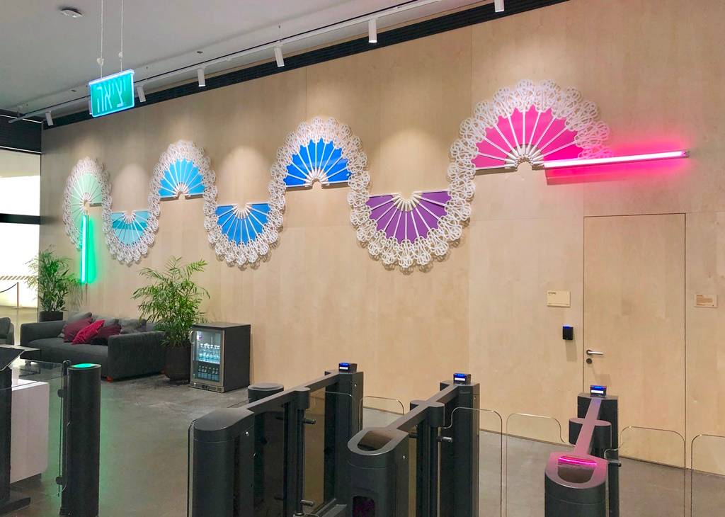 Dusty Wave – חובטי שטיחים שזורים על לוחות עץ צבועים באפוקסי ותאורת פלורסנט. עבודת קבע בלובי של משרדי פייסבוק תל־אביב, מגדל שרונה עזריאלי.