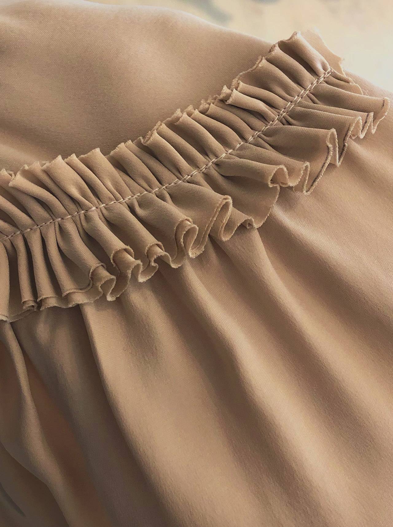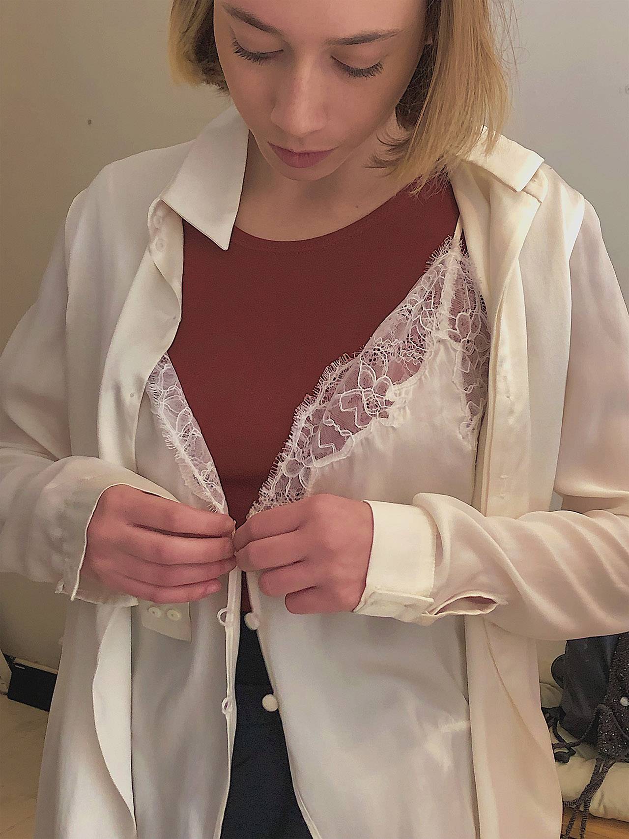 זה הפריט שמתמצת את ההשראה שלי. הוא מורכב מחיבור בין חולצת משי וגופיית קומבניזון, ומשקף את הרגע שבו אשה מתפשטת ורואים גם את השכבה התחתונה של הבגדים וגם את העליונה. זה התרגום שלי לשניה הזו. העובדה שהצלחתי להגיע לזה בצורה לבישה ועשויה להפליא היא השג מבחינתי. כשהצגתי את הקולקציה בפרזנטציה של חממת מפעל הפיס הצהרתי שהפריט הזה הוא נקודת המוצא של הפרויקט.