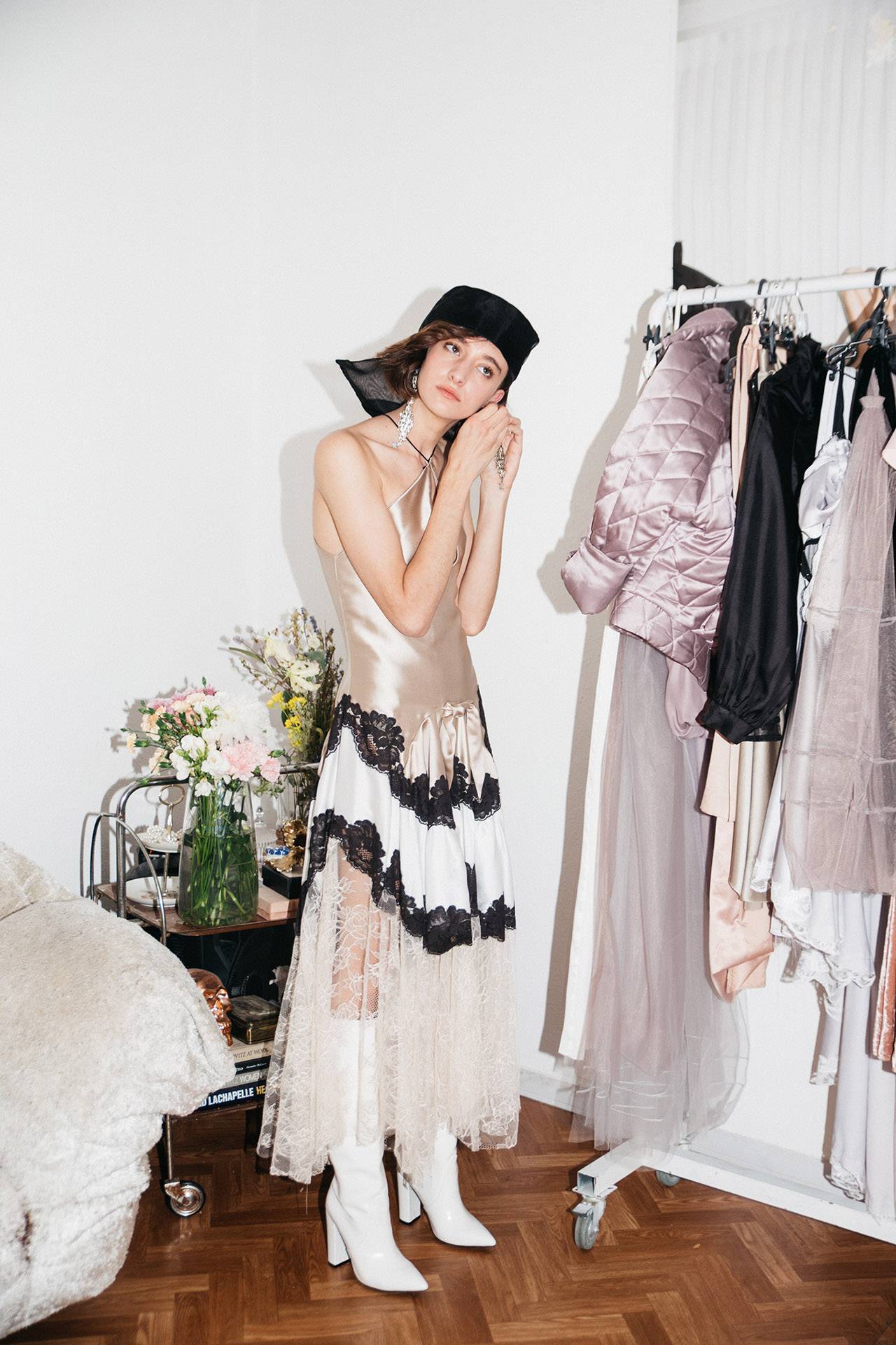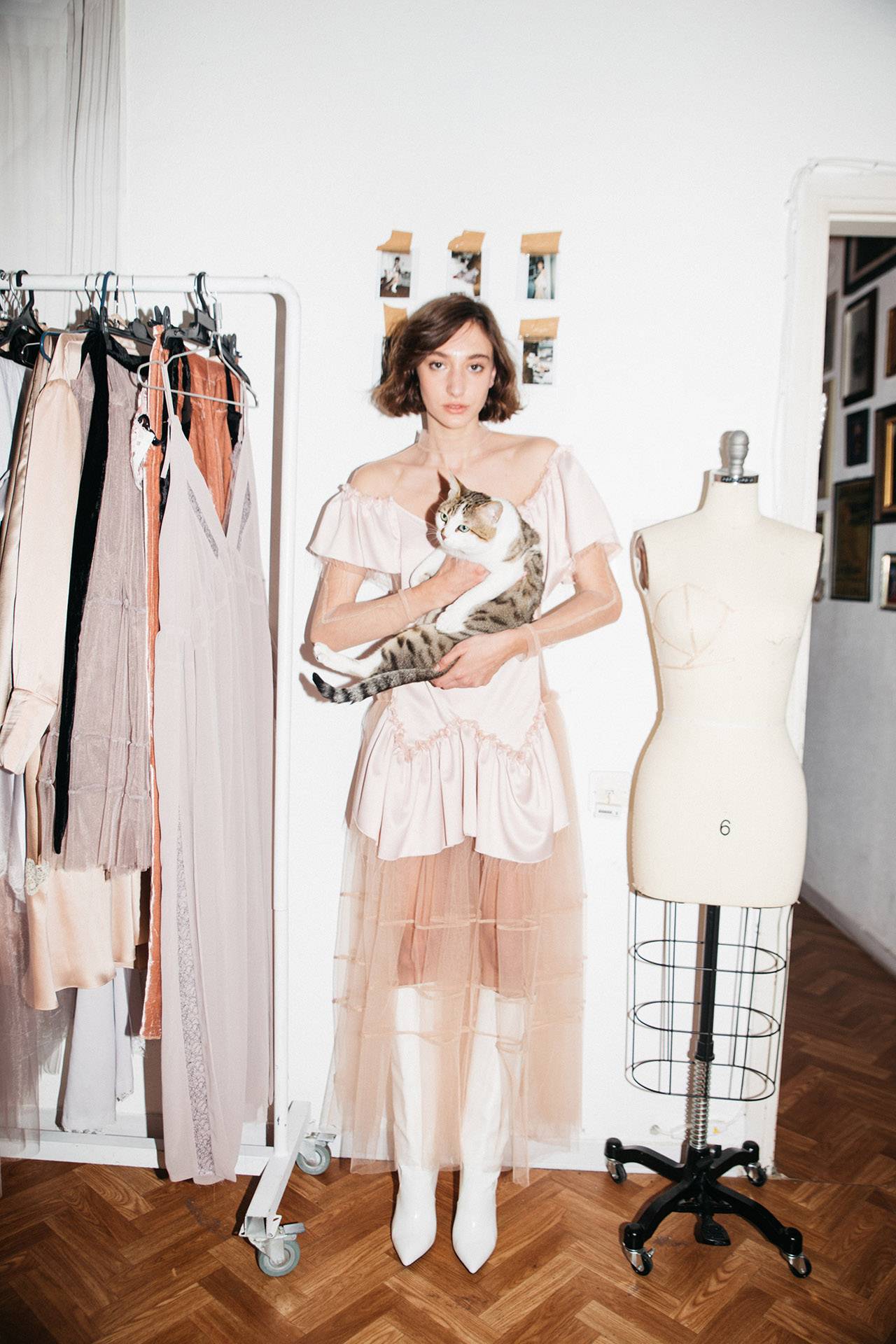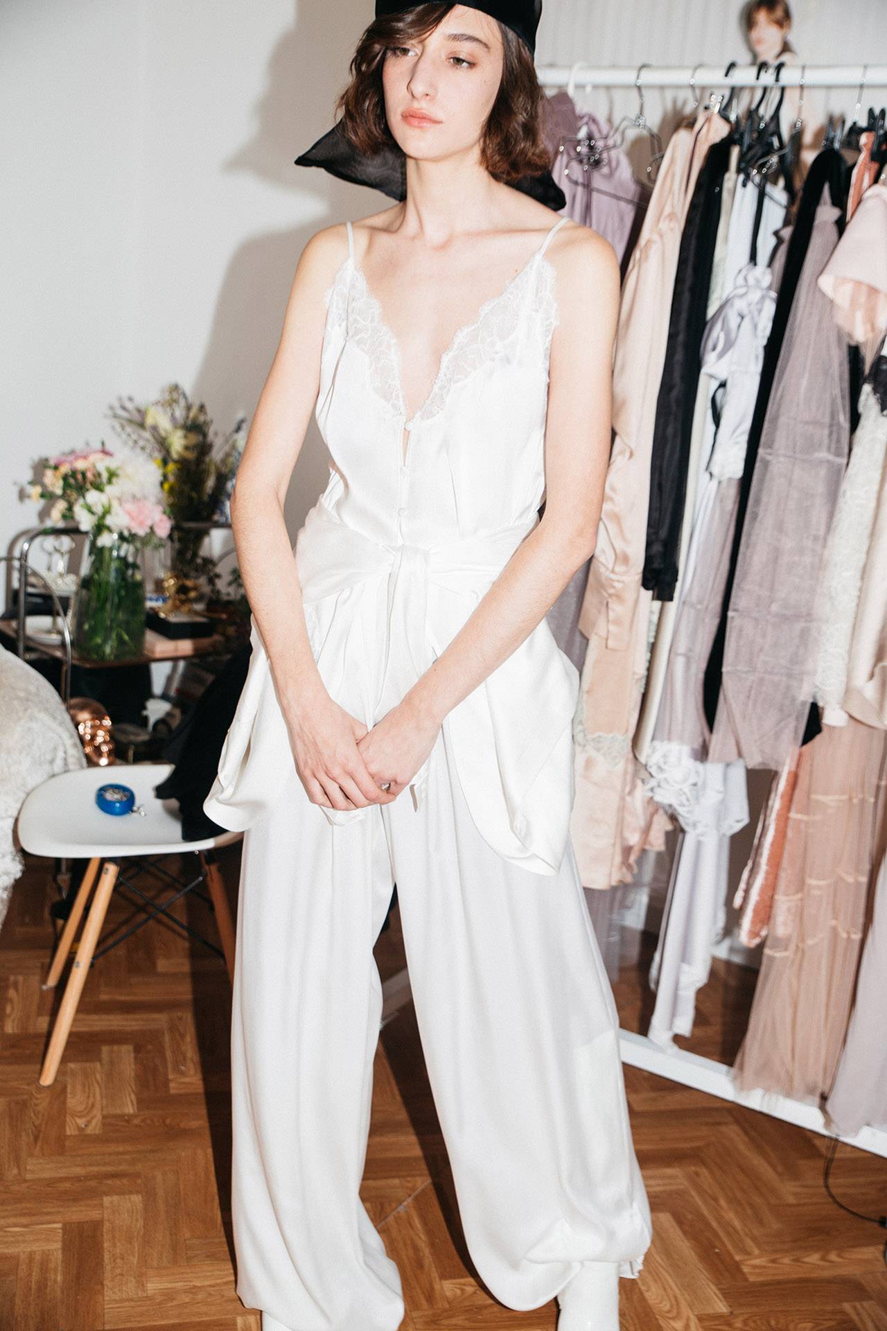 משי באיכות גבוהה, תחרה בייבוא אישי מצרפת – החומר הוא מה שמפעיל ומניע את העיצוב; החיפוש אחר טקסטורות, צבעוניות, שכבות ושקיפויות. אני עובדת בדיגום חופשי, דגם אחד מוביל לשני ולשלישי, השאיפה שלי היא ליהנות מתהליך היצירה ולכן אני לא מכוונת ומתכננת מראש. מה שכן מכוון אותי הוא כמיהה נוסטלגית לגלאם של עשורים קודמים, וגם אהבה וקבלה עצמית, עם כמה שהוזילו את המושגים האלה.