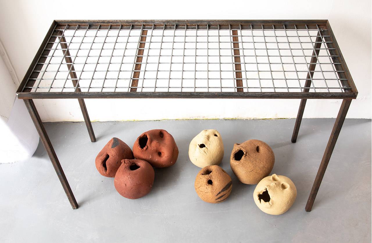לצד עבודתיי מוצגים צילומי השדות השרופים שצילם בעלי דן שומרוני, שמתעדים את הטבע הנעלם בזמן אמת, ואלו מעצימים את אווירת התוגה, החרדה והדאגה. הדיאלוג בין פנים וחוץ באלמנטים הקרמיים שאני יוצרת, הוא המוביל העיקרי בכל עבודותיי. המגע האינטימי עם החמר מאפשר לי לבטא הרהורי לב ובטן.