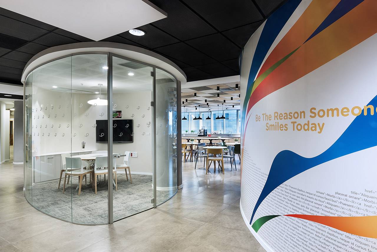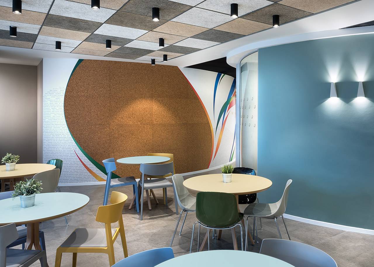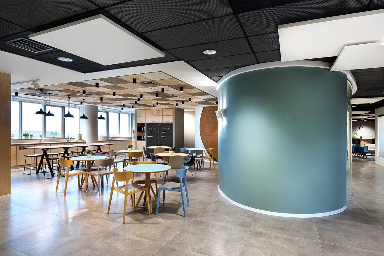 חדר ישיבות, שתוכנן כחלל מעוגל עשוי גבס וזכוכית שקופה, ממוקם בקרבת הכניסה לקפיטריה, ובמיקומו משמש כאלמנט הגדרה: יוצר הפרדה בין אזורי העבודה, ובה בעת גם זרימה בין האגפים השונים. הקפיטריה עוצבה כחלל גדול שמכיל מטבח גדול ואזורי ישיבה רבים, שמזמנים ומזמינים קיום מפגשים שונים בין העובדים.