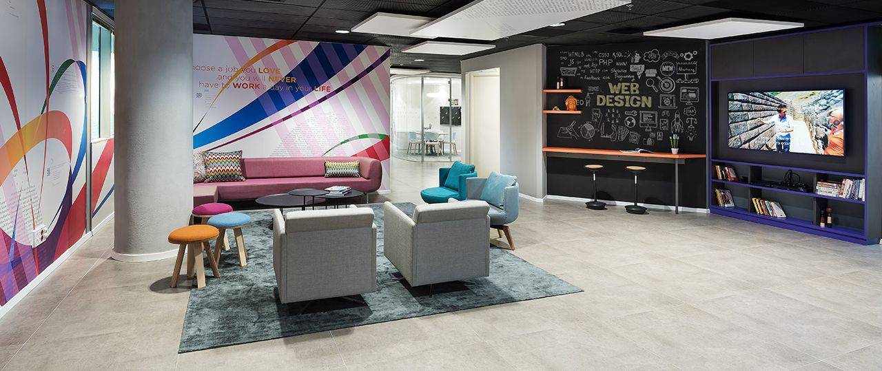 המקום תוכנן כך שישדר קלילות ודינמיות, שבאות לידי בזרימת החללים, בצבעוניות ובגרפיקה ששולבה על הקירות (עוצבה בשיתוף סטודיו שגיא רכטר). בחלל הכניסה תוכננו פינת ישיבה גדולה ומזמינה, וכן ספריה גדולה מחופה פורמיקה צבעונית, טלוויזיה וקיר לכתיבה ויצירה אישית. התקרה טופלה כך שתהווה אלמנט ויזואלי במרחב: במרבית שטחו היא עשויה מרשת תלת־ממדית עם שילוב אריחים שמרחפים ״סולו״, ובאזור הקפיטריה היא עוצבה כתקרת צמר עץ במגוון גוונים.