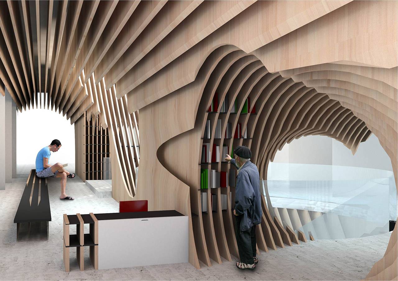 לאחר מכן, התחילה לגרוע מתוך מסת הפלטות קונוסים בגדלים ובכיוונים שונים, וכך נוצר חלל של ספרייה. שיטת עבודה זו יצרה חוויה טוטאלית בעבור המתהלך בחלל – התחושה היא שפלטות העץ עוטפות אותו, ושהוא רואה ולא רואה בו זמנית את כל המתרחש סביבו. בתוך הספרייה נוצרת תחושה של הצצה אל המבקרים האחרים מעבר לפלטות ובכך ההבדל בין הפרטי לציבורי מיטשטש.