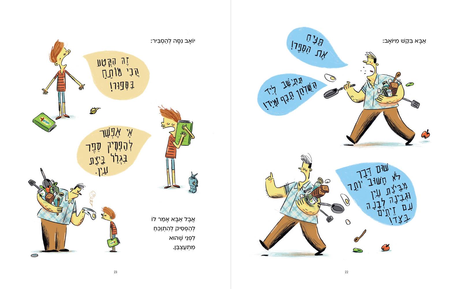 התהליך של האיור פחות או יותר עבד כמו באיור ספרים קודמים. אחרי שהייתה פריסה סופית של הספר, שזה סוג של סטוריבורד, המשכתי לעיצוב הדמויות ומשם לאיור את הכפולות. אני בדרך כלל לא מבצע איורים לפי הסדר, אלא מתחיל מאיור שאני מרגיש שיש לי חזון ויזואלי בעבורו והוא משמש לי תבנית לסגנון של שאר האיורים הספר.