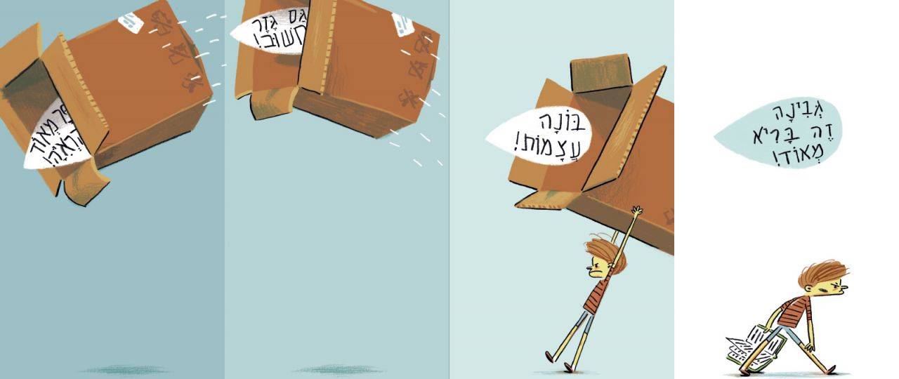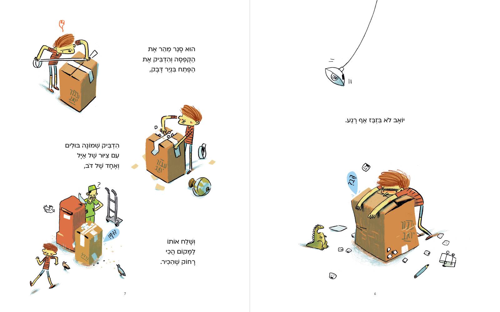 מה שהשתנה בספר תוך כדי עבודה היו סיפורי המשנה שנמצאים ברקע של הסיפור. כמו שציינתי, יש לי תמיד רצון לספר סיפור מקביל לטקסט, ולקח לי זמן איפה אני יכול לעשות את זה. אז יש את הדוור שמקבל את החבילות ודואג להם, אבל אז גיליתי תוך כדי עבודה (באמת, יש דברים שלא חושבים עליהם עד שהספר חצי מוכן), שליואב יש הרבה צעצועים. לכן החלטתי לתת להם להצטרף אליו ולהגיב יחד איתו לסיטואציות בספר. אפשר גם לקרוא את זה כאילו יואב עצמו מציב אותם, כהמשך של הרגשות והמחשבות שלו. עם זאת , יש רק מקום אחד שאחת הבובות ״קמה לתחייה״, אבל אני לא מגלה איפה