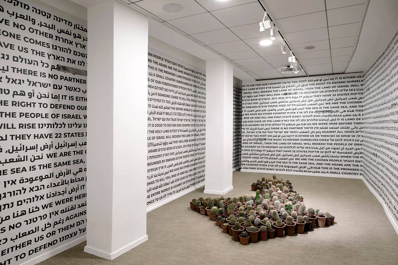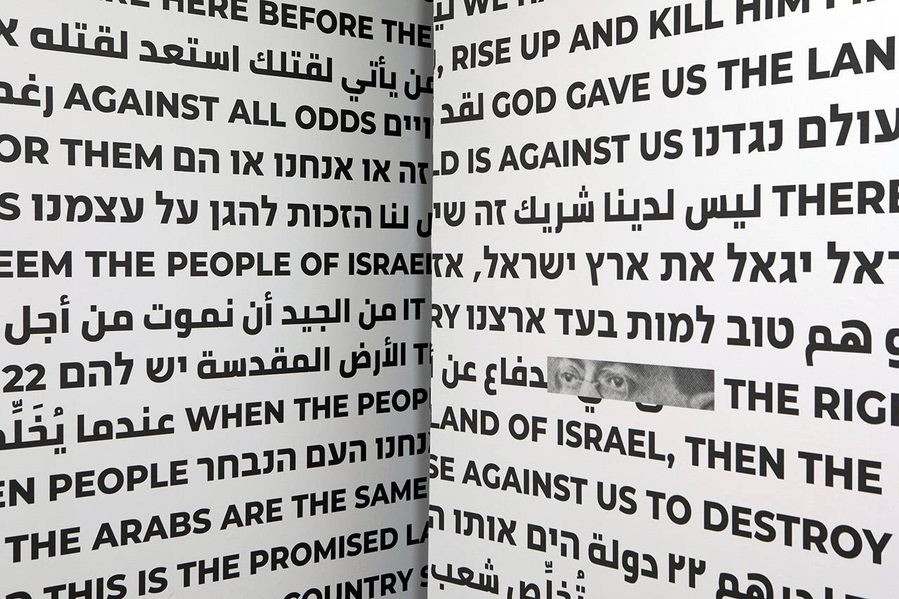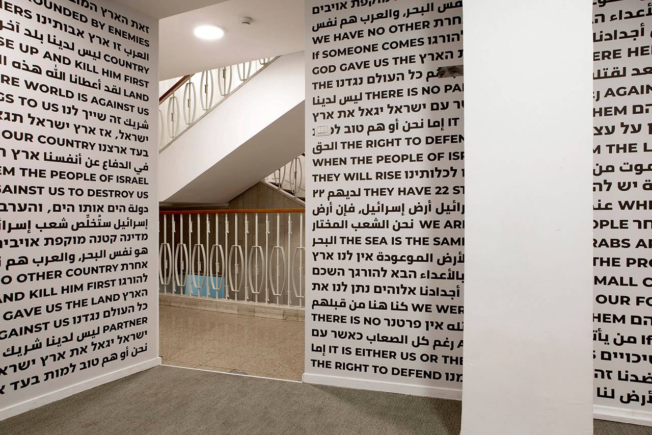 בלונדון התוצר היה אותו קיט סטנסלי, וכאן עשיתי משהו שונה. הרחבתי מעט את היריעה. העבודה הפעם מחולקת לשלושה חלקים, שכולם תוצר של אותו מחקר. פרק אחד בתערוכה עוסק במשפטים: עטפתי את כל קירות חלל הגלריה באותם מסרים, רציתי לשקף את חווית הרוויה. החנק. אם בלונדון זה היה משרד החינוך שהיה חתום על אותו קיט – כאן אני פונה אל כל מנהיגי המדינה לדורותיה, שבמידה מסויימת קעקעו בדמנו את אותם נרטיבים. הוספתי על גבי המשפטים צילומים של עינים של אותם מנהיגים. עינים שלא מסתכלות ישירות אלינו. הן פונות לצדדים. קצת מתביישים, קצת לא מוכנים להישיר אלינו מבט. והחלל הופך להיות כמו קיר עם חורי הצצה. ספק הם מציצים אלינו, ספק אנחנו עליהם