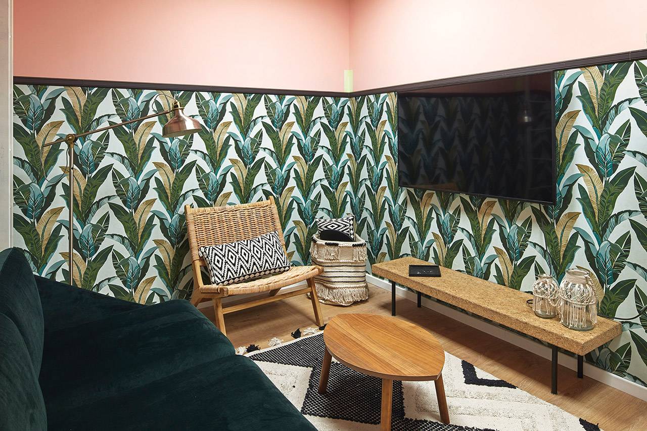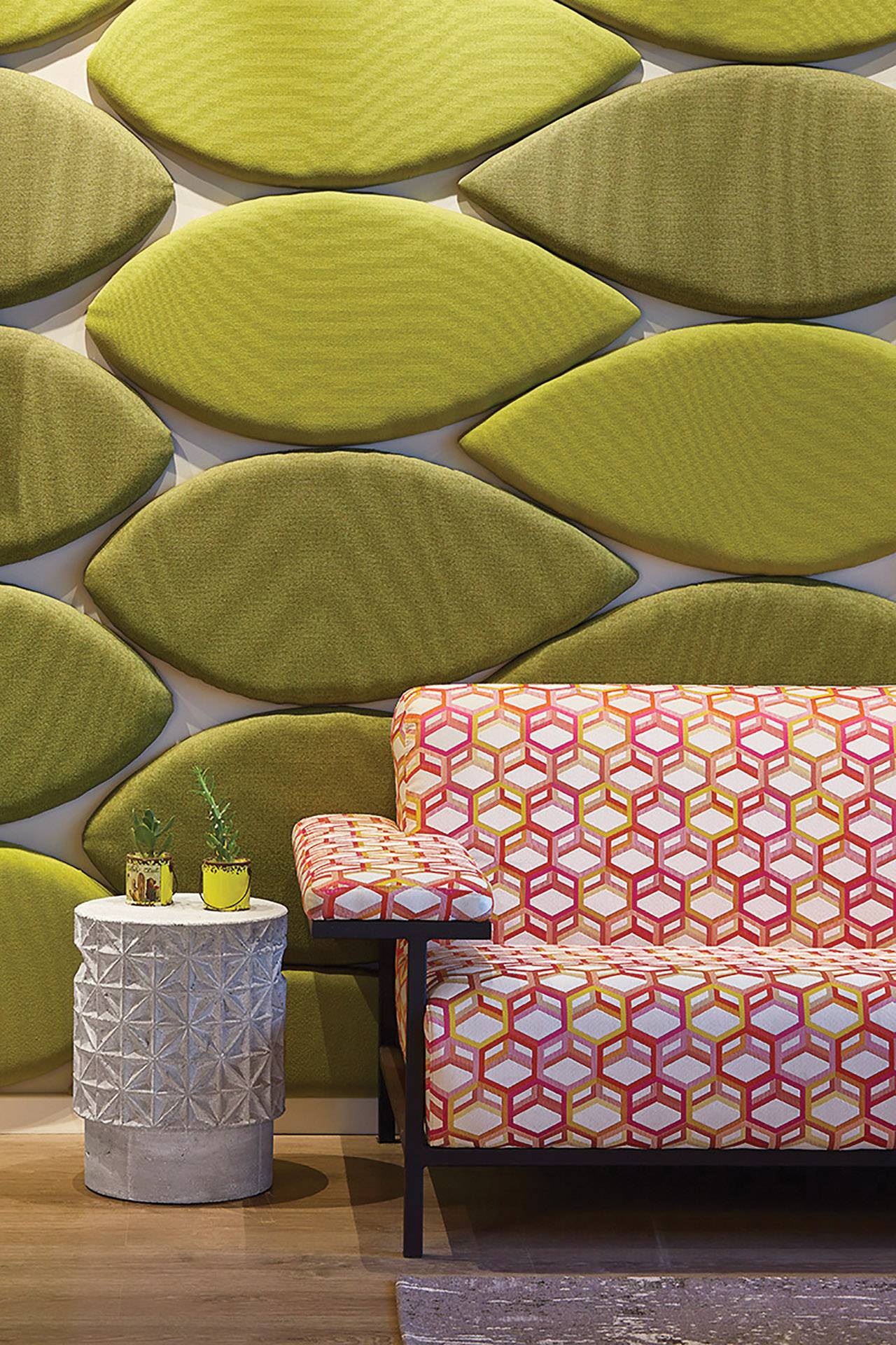 רכיב מרכזי נוסף בחלל הוא קיר כוח שבנוי מאלמנטים מעוגלים, מרופדים בבדים ירוקים בצבעוניות משתנה, ומשמש גם כקיר אקוסטי בחלל המשותף שפתוח אל חלל הסלון. מאחר שתקציב הפרויקט היה מוגבל וזמן התכנון וההקמה שהקוצב לו היה קצר, נדרשנו ליצור פתרונות יעילים בכל הקשור לבחירת החומרים ודרכי הביצוע, ולשמחתנו הם הוכיחו את עצמם. התהליך היה אינטנסיבי, מפרך ומאתגר אך גם מהנה, והתוצאה שהתקבלה שווה את המאמץ.