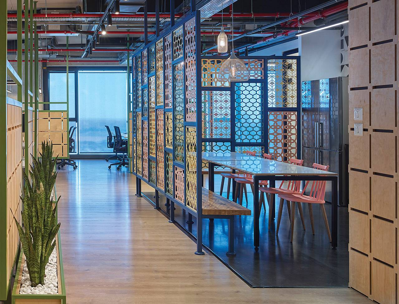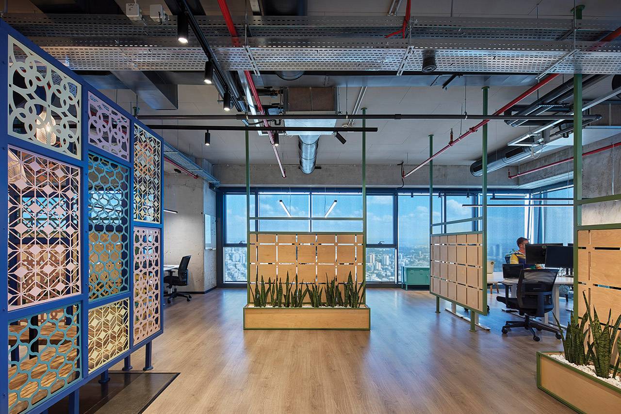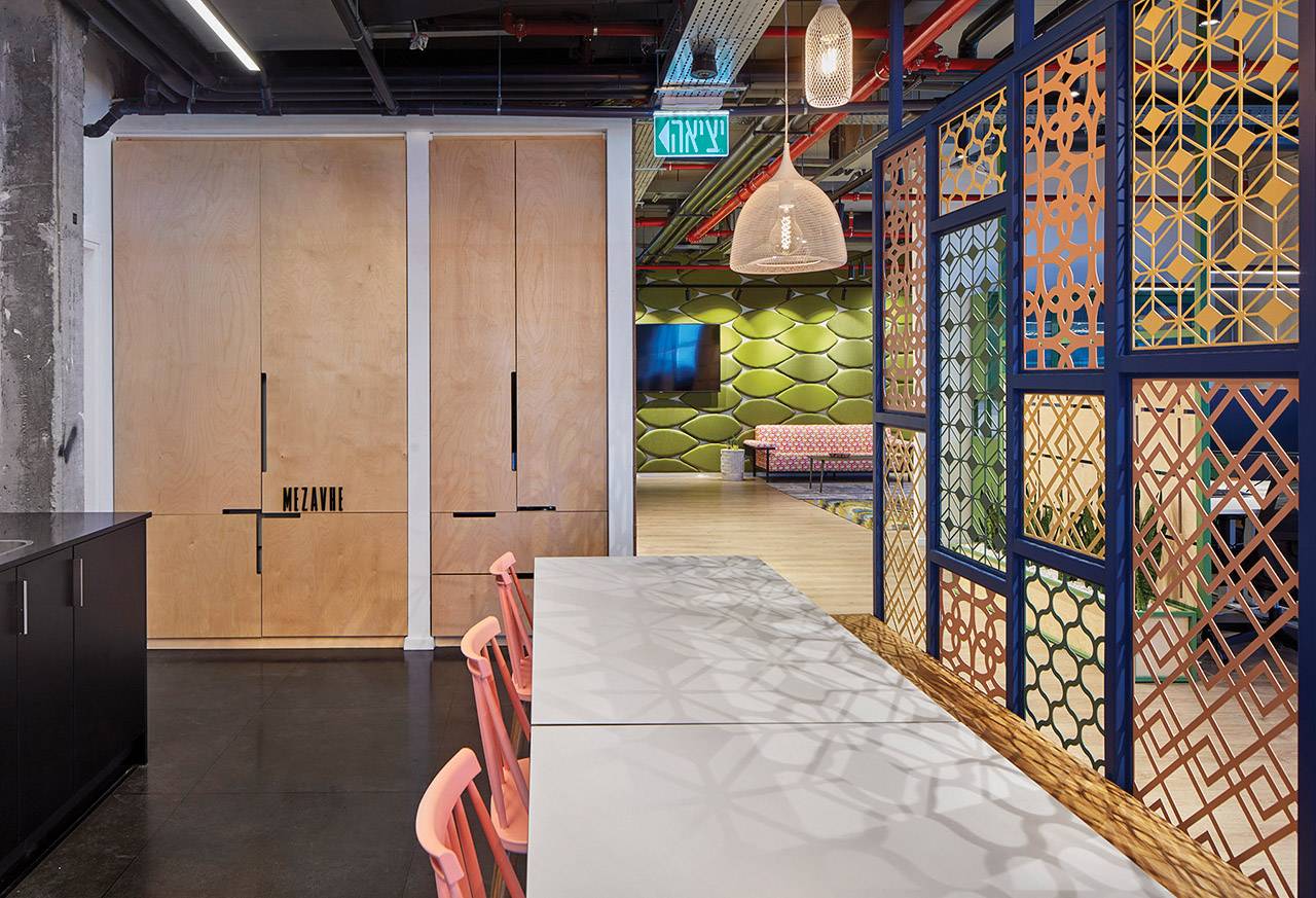 חלל העבודה המרכזי נחלק לשניים, שביניהם מעבר מרווח. אזור עבודה אחד, שנושק לחלונות הגדולים, מיועד לעמדות העבודה של הצוותים ומופרד במחיצת מתכת, משולבת צמחי סנסיברה שמתאימים לחללים סגורים ומטהרים את האוויר. האזור השני נושק ללב הבניין, שם אין חלונות כלל, ולכן מוקמו בו חדרי ההנהלה שדורשים יותר פרטיות, וכן חלל המטבח והאוכל, המופרדים במחיצת מתכת בדיגום משרביה. בקצה המעבר נקבע חדר ישיבות רחב ידיים, והממ״ד המסופח למשרד הפך לחלל ישיבות אינטימי ונעים למי שצריך עבודה בחלל מופרד וסגור.