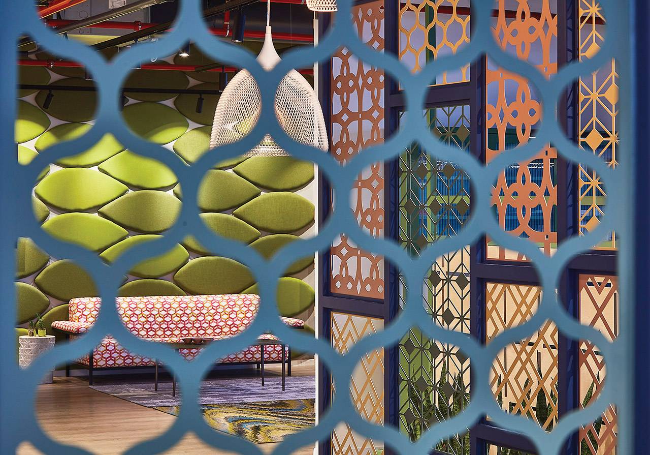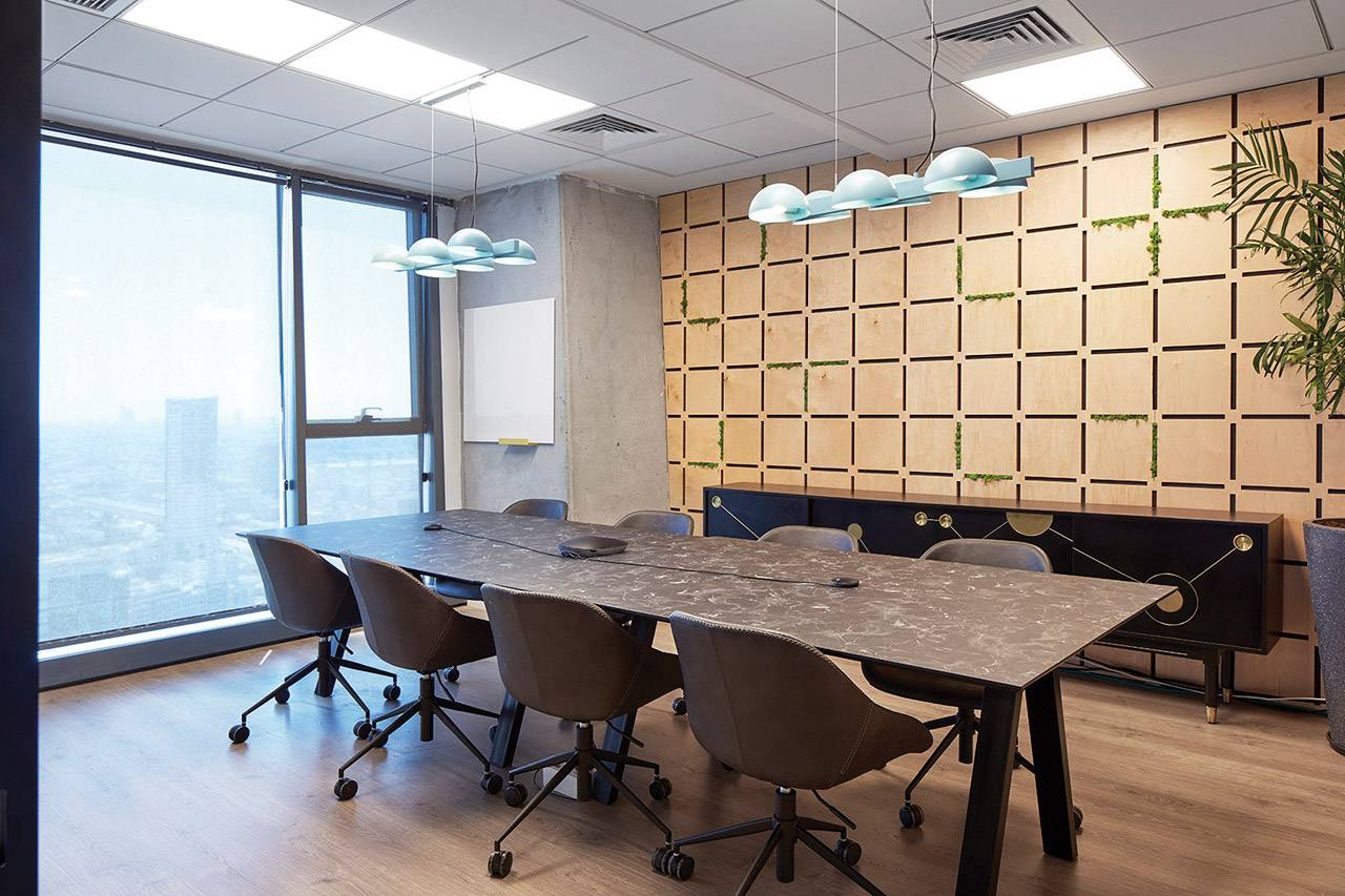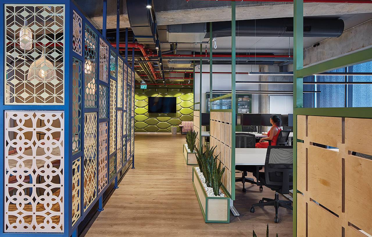 חלל העבודה המרכזי נחלק לשניים, שביניהם מעבר מרווח. אזור עבודה אחד, שנושק לחלונות הגדולים, מיועד לעמדות העבודה של הצוותים ומופרד במחיצת מתכת, משולבת צמחי סנסיברה שמתאימים לחללים סגורים ומטהרים את האוויר. האזור השני נושק ללב הבניין, שם אין חלונות כלל, ולכן מוקמו בו חדרי ההנהלה שדורשים יותר פרטיות, וכן חלל המטבח והאוכל, המופרדים במחיצת מתכת בדיגום משרביה. בקצה המעבר נקבע חדר ישיבות רחב ידיים, והממ״ד המסופח למשרד הפך לחלל ישיבות אינטימי ונעים למי שצריך עבודה בחלל מופרד וסגור.