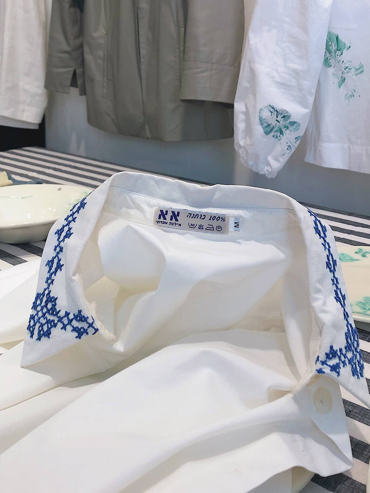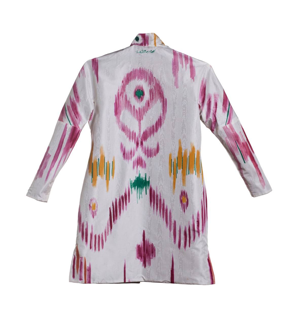 מצדו האחד המעיל מבוטן משי בדוגמת טקסטיל ״איקט״ מסמרקנד שציירתי בעצמי, ומצדו השני החאקי, המדים הישראלים שמחקו תרבויות וזהויות אתניות של מי שעלה ארצה. כך חיברתי בין שני העולמות: המסורתי והאלגנטי עם הצנוע והפרקטי. כמעצבת ישראלית אני מחפשת לתת תשובות עכשוויות שמבטאות משהו לגבי האופנה המקומית. לא מעניין אותי לקבל השראה מארץ רחוקה.
