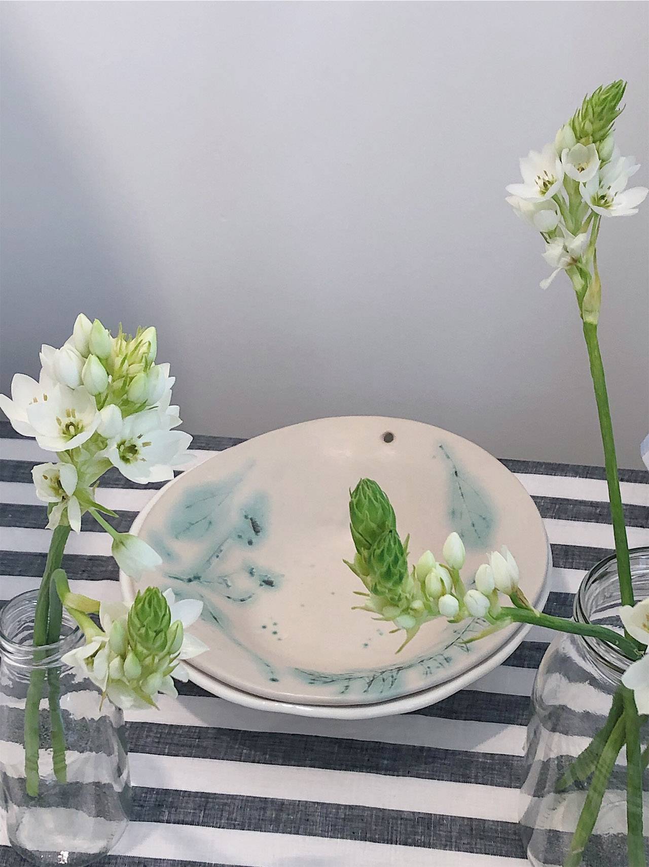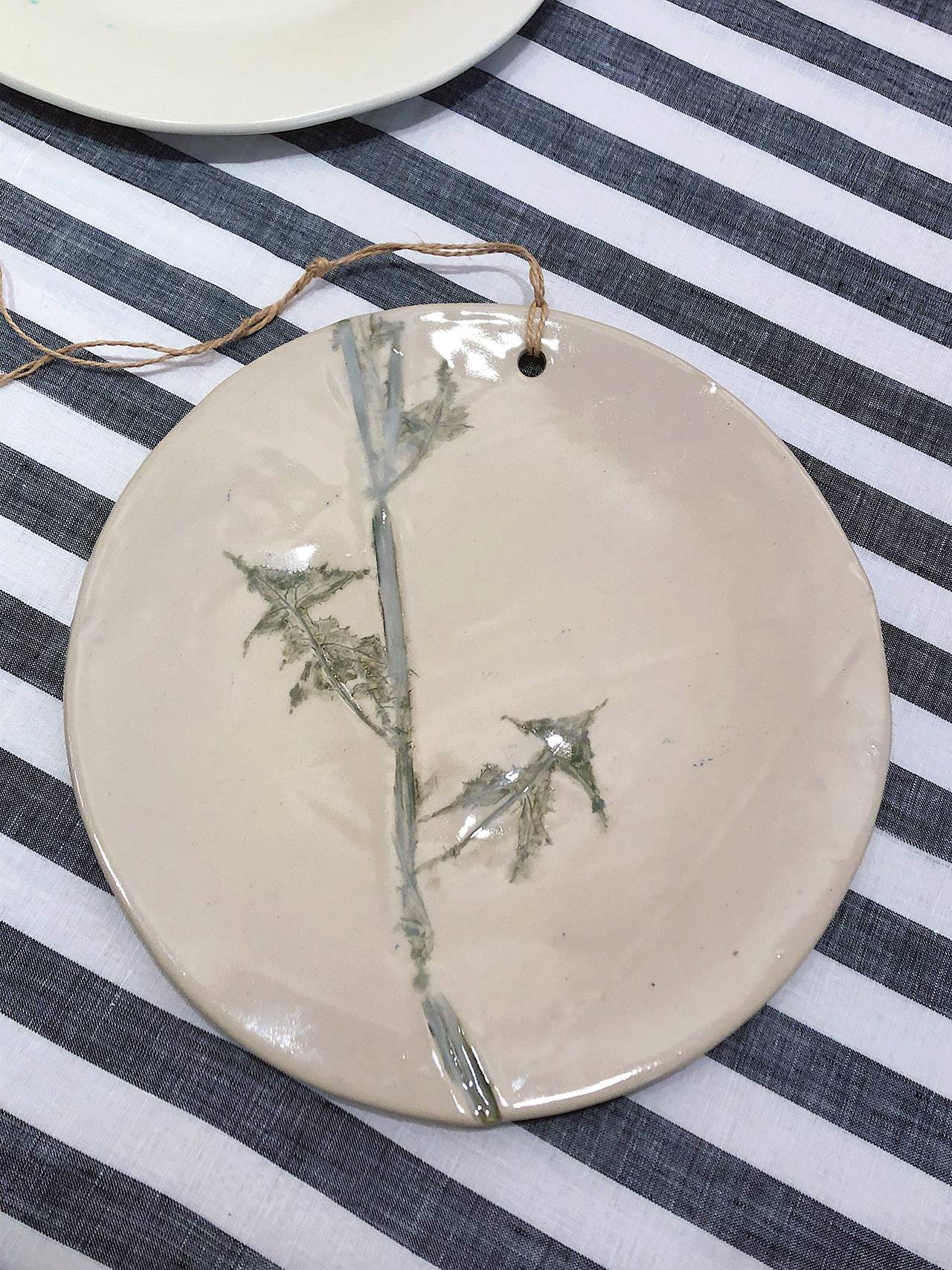 כריכת הספר היא פרט מתוך צלחת קרמיקה שהכנתי. זה סוג נוסף של תיעוד שאני עושה: סרוויסים בהטבעת צמחים שאני מוצאת באיטליה או בתל אביב. נוצרת סדרה של ״מאובנים״ שאפשר לחוש עליהם את הטקסטורה של הצמח, ואף צלחת אינה זהה לקודמתה, כמו בטבע. בצלחות יש חור שאפשר להשחיל דרכו פתק ולכתוב משהו, בין אם איחול חג שמח או שם של מי שמיועד לשבת ליד הצלחת, כפי שנהוג בסעודות באירופה. לחילופין אפשר לחבר את המפית או להשתמש בלולאה לתלייה וליצירת קיר צלחות שמייצר תמונת נוף.