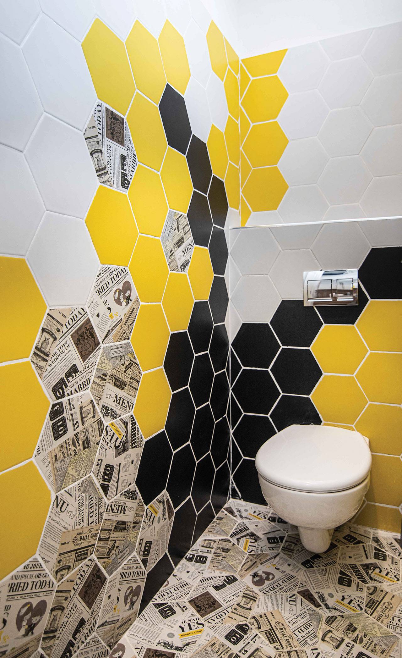 בקומה הראשונה הנוף שוב שונה לחלוטין, מכובד, רגוע ומאופיין בגוונים קלאסיים: ריצוף אפור בהיר לצד תקרה וקירות שנצבעו בסוג של לבן. חדרי השירותים עוצבו כשילוב יצירתי ומגוון של צורות וצבעים.
