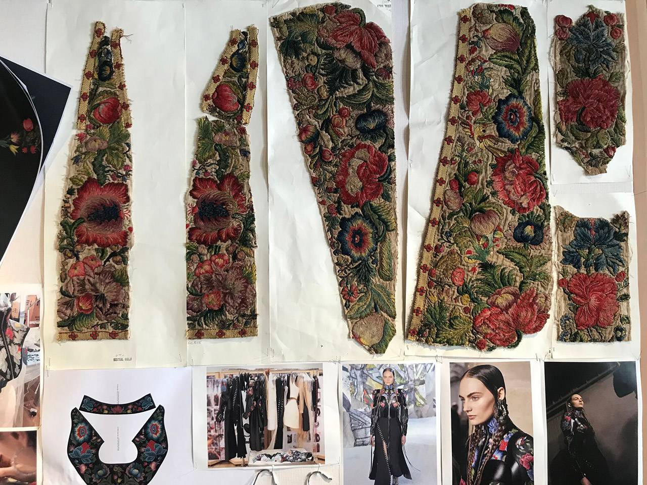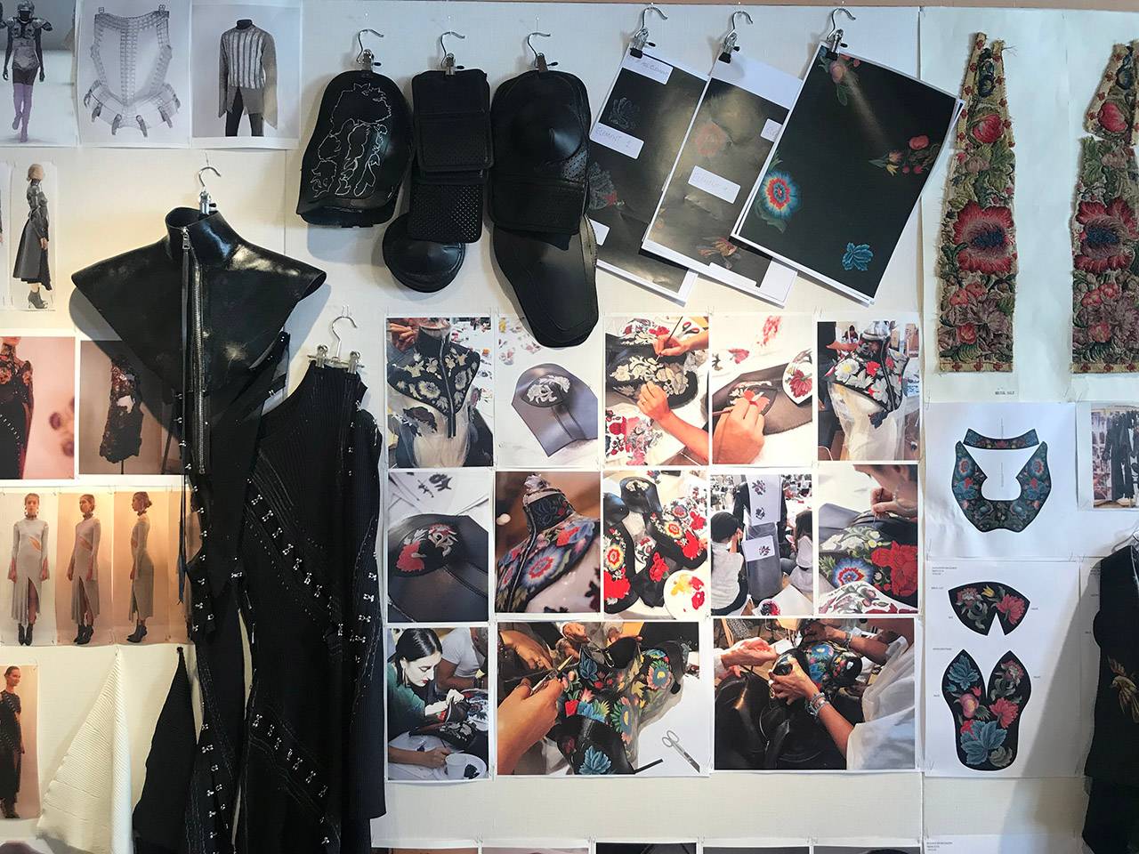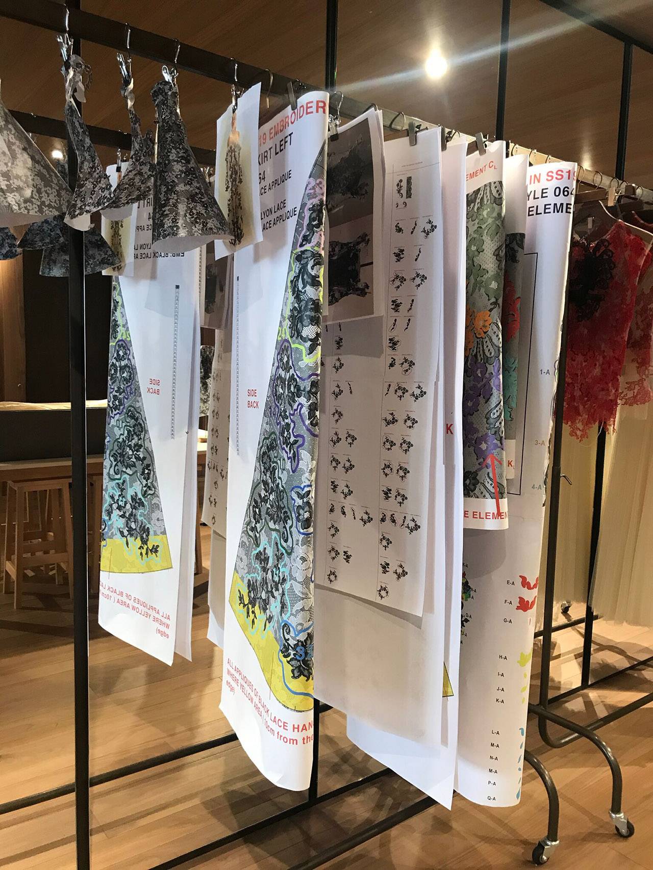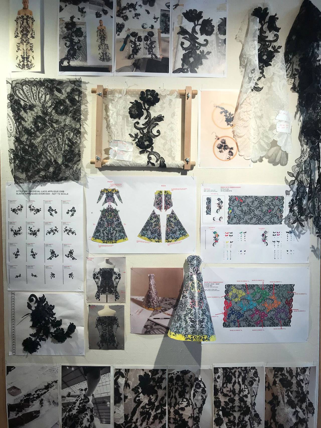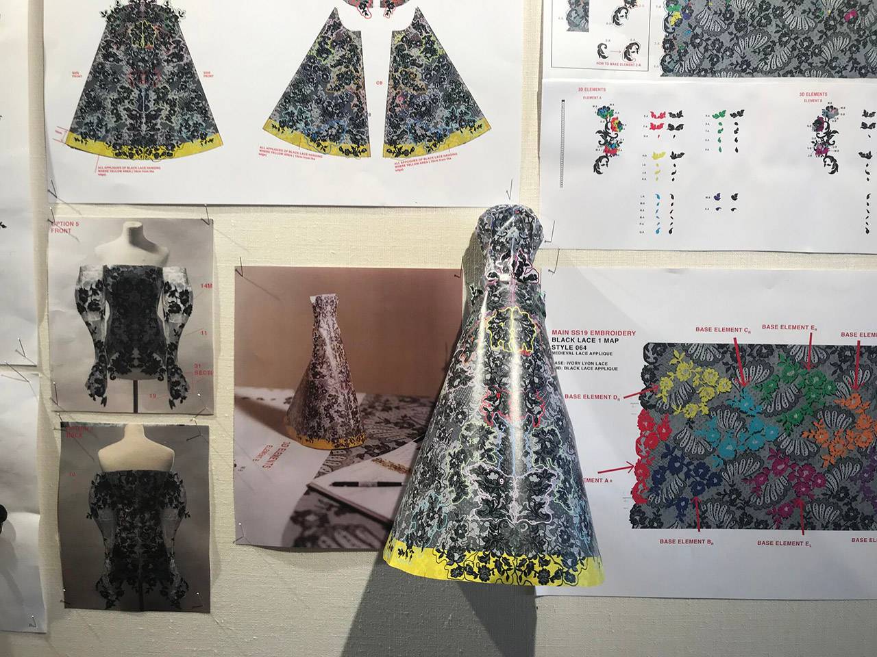 בחשיבה ובעבודה מדוקדקת נעשה מיפוי של כל חלק בבד הרקמה לניצול מקסימלי כך שמראש יריעת הבד מחולקת לחתיכות המסומנות במחשב בצבעים שונים. כל צבע מותאם למיקום ספציפי על השמלה וצוות הייצור מקבל הוראות מפורטות אילו חתיכות גוזרים ואיך. את הדגם הסופי מייצרים קודם כל בעבודת מחשב דו־ממדית, מדפיסים והופכים את השמלה לתלת־ממדית כדי להבין ולראות את הפרופורציות שלה ואיך הרקמות מתחברות יחד. כשהדגם מוכן, ההוראות המפורטות והטואל המוקטן ישמשו את צוות הייצור. את הרקמה יוצרים בשתי שכבות לאחר שרקמו אותה בחרוזים, וכך היא הופכת לתלת־ממדית. דגם זה עוצר נשימה כשמבינים את החשיבה העמוקה של הצוות על העיצוב, הפרטים וגם על חיסכון בחומר.