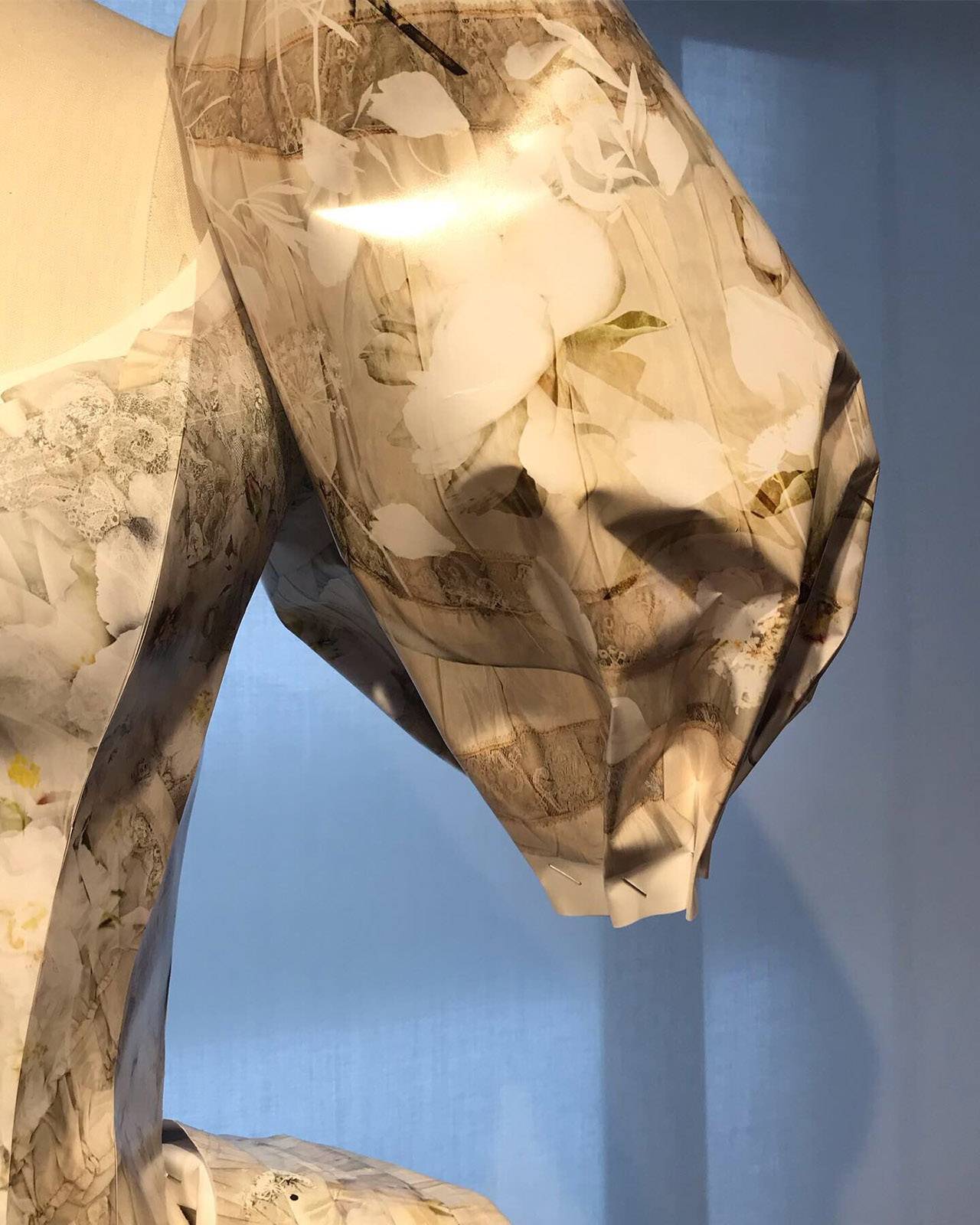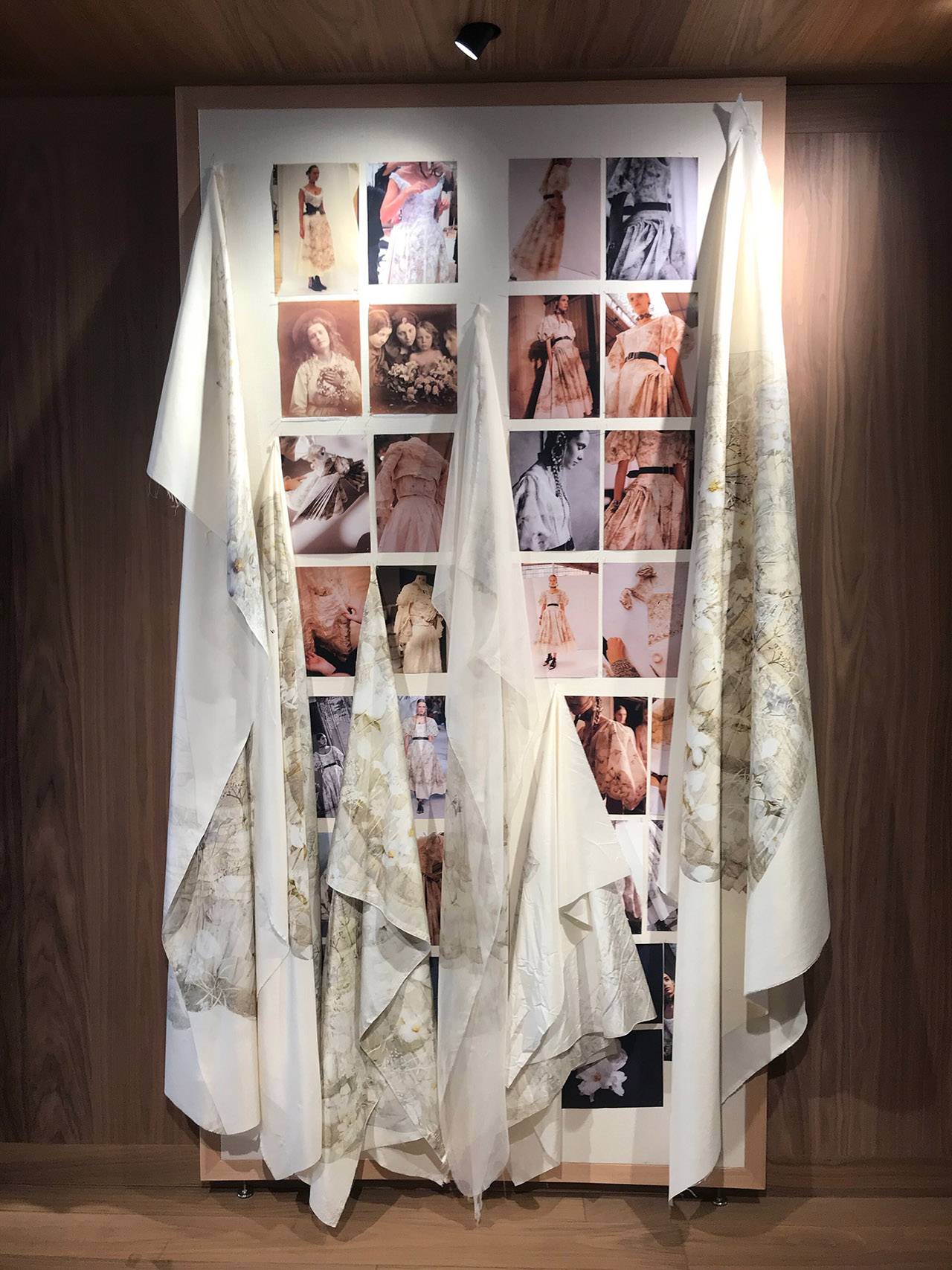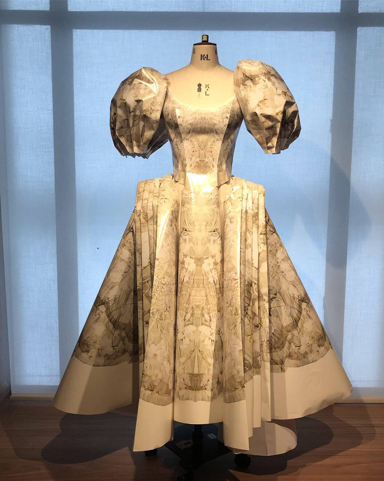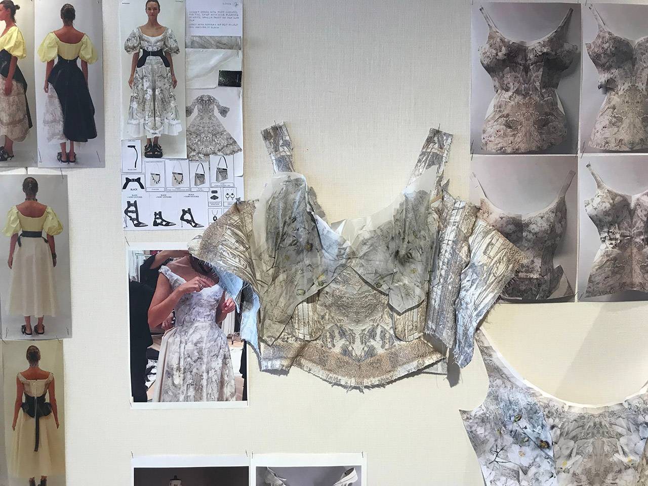 ברטון רצתה לשמר את השמלה ששימשה לחתונות בזיכרון ההווה. היא והצוות שלה השתמשו באמצעים הטכנולוגיים של סריקות רנטגן של בגדים (תהליך שהפך לזמין וחיוני בארכיוני האופנה השונים בעולם), ואת הסריקה של הבגד הזה שילבו כהדפס לשמלה שלהם. לסריקת הרנטגן הם הוסיפו צילומים של פרחים אנגלים שצילמו בסיור שערכו בצפון המדינה.
