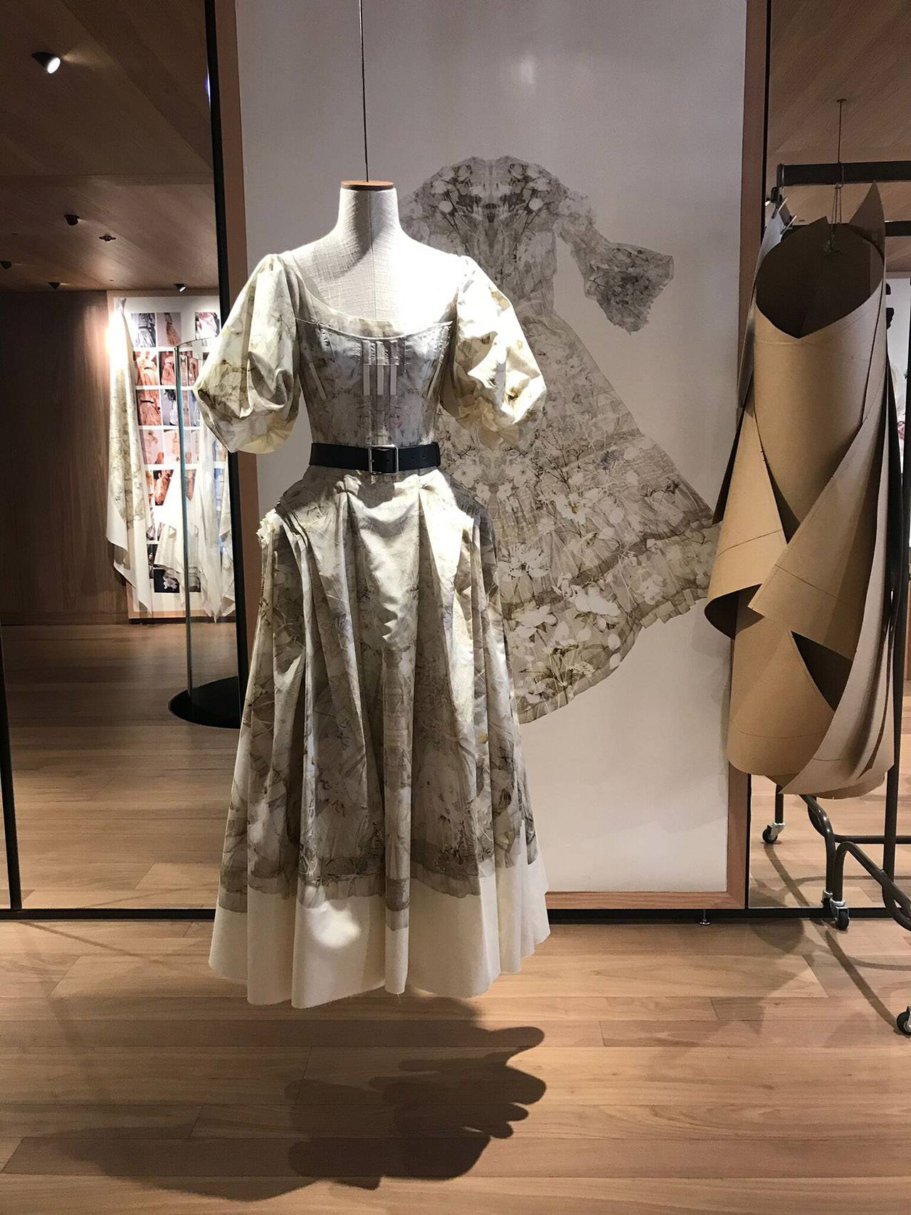 שלושה פריטים לכדו את עיניי ושבו את ליבי. הפריט הראשון, שמלה מודפסת עם מחוך מובנה בתוך השמלה. על השמלה ישנו הדפס שבמבט ראשון לא ברור פשרו, הרבה פרחים וצורות גיאומטריות ״מקוויניות״ שכאלה עם קפלים באזור הירכיים. עובדת הגלריה הסבה את תשומת ליבי לשמלה ויקטוריאנית משוק פורטובלו שהונחה במרכז השולחן. היא הסבירה שהשמלה הזו היוותה את ההשראה לדגם הזה בצורה שלה, בעיטורים שעליה, אבל גם בהדפס.