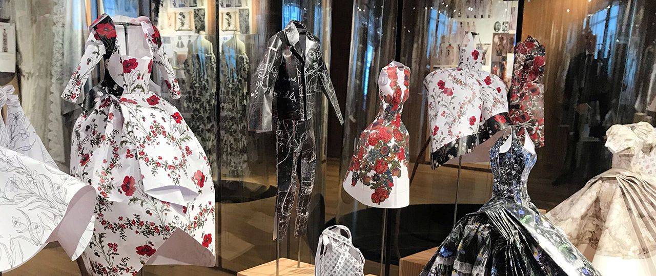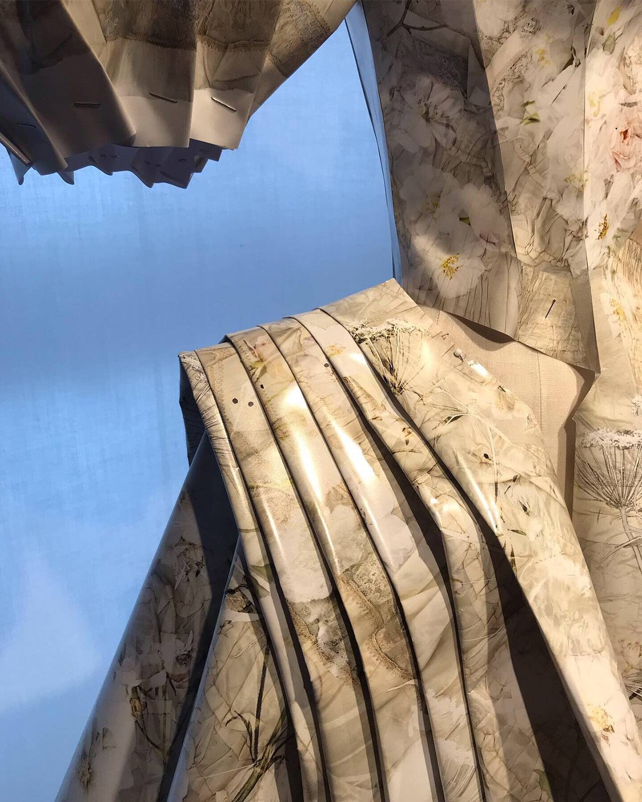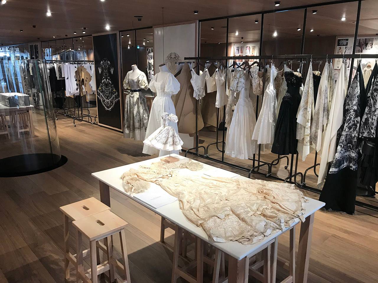 לא כל כך ידעתי למה לצפות, אבל במעלה המדרגות, עמדה עוד עובדת של החנות. היא הציעה הסבר על התערוכה, שמציגה חמישה דגמים מקולקציית אביב־קיץ 2019 לנשים ודגם אחד מאותה הקולקציה לגברים. כל דגם עולם ומלואו של סיפורים, עולמות שונים, חומרים, תהליכי עבודה, צבעוניות וכל תוצאה סופית מרהיבה יותר משכנתה לתערוכה. היא לא ידעה שהיא תלווה אותי כשעתיים בהסברים מדוקדקים שיכללו מישוש של כל האובייקטים וסשן של צילומים בסופו.