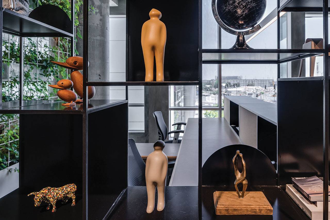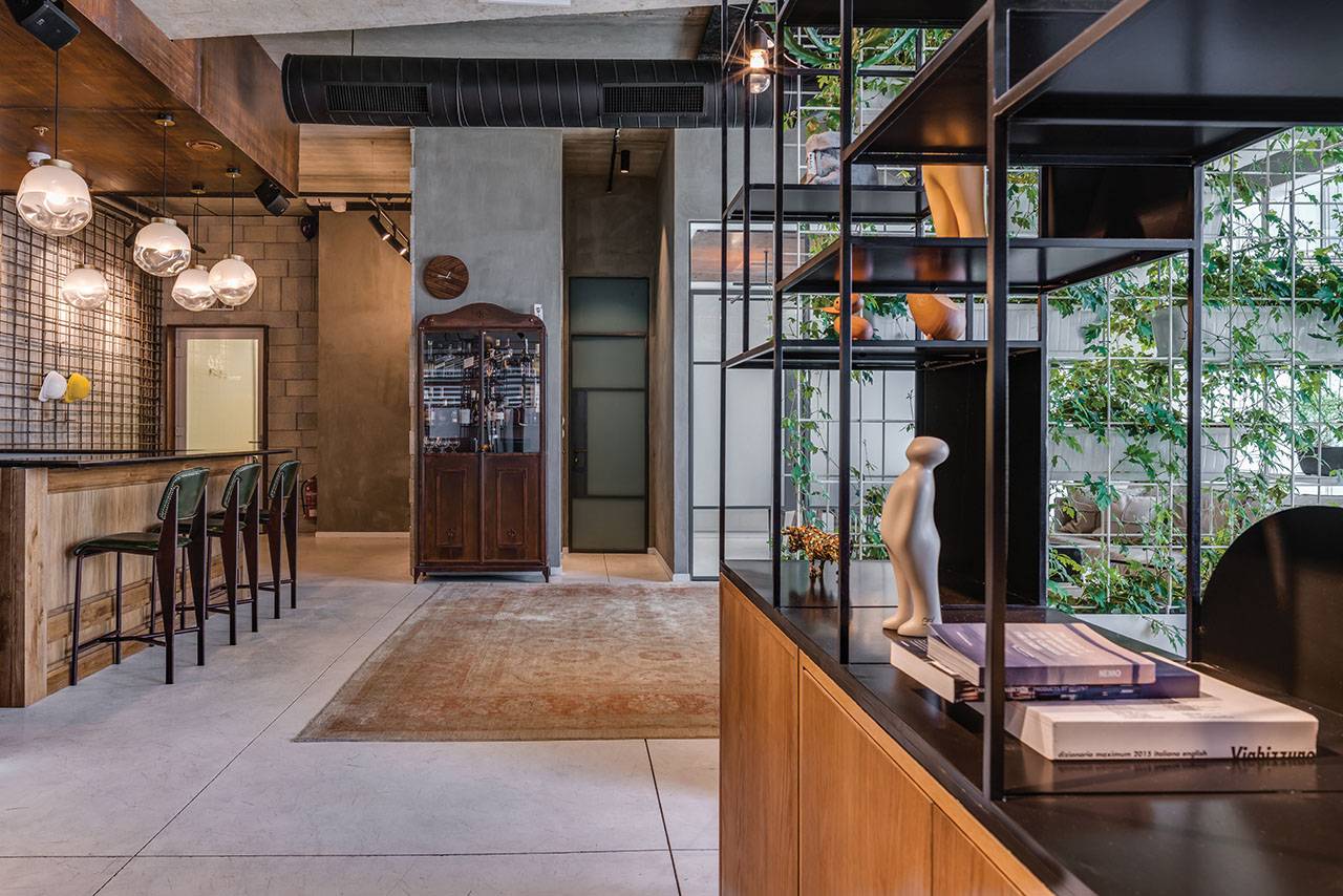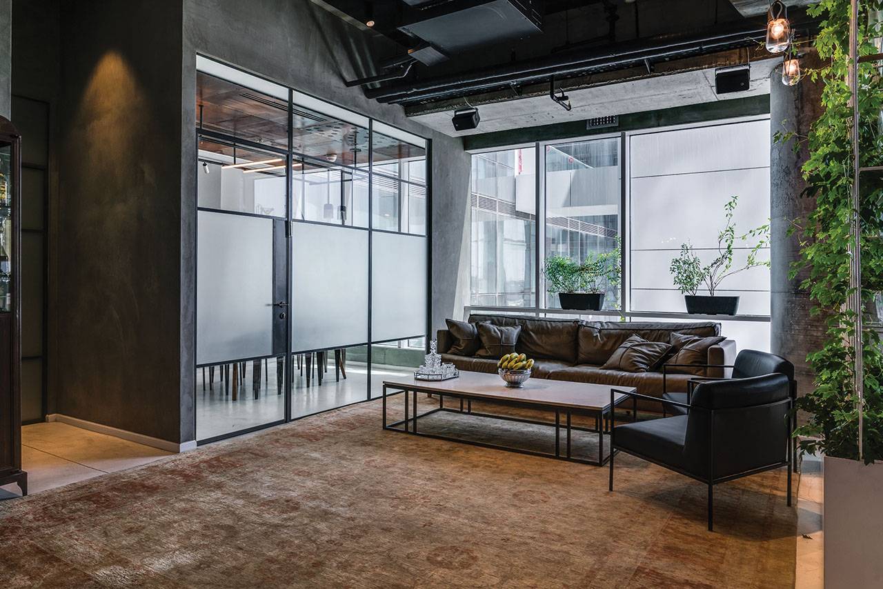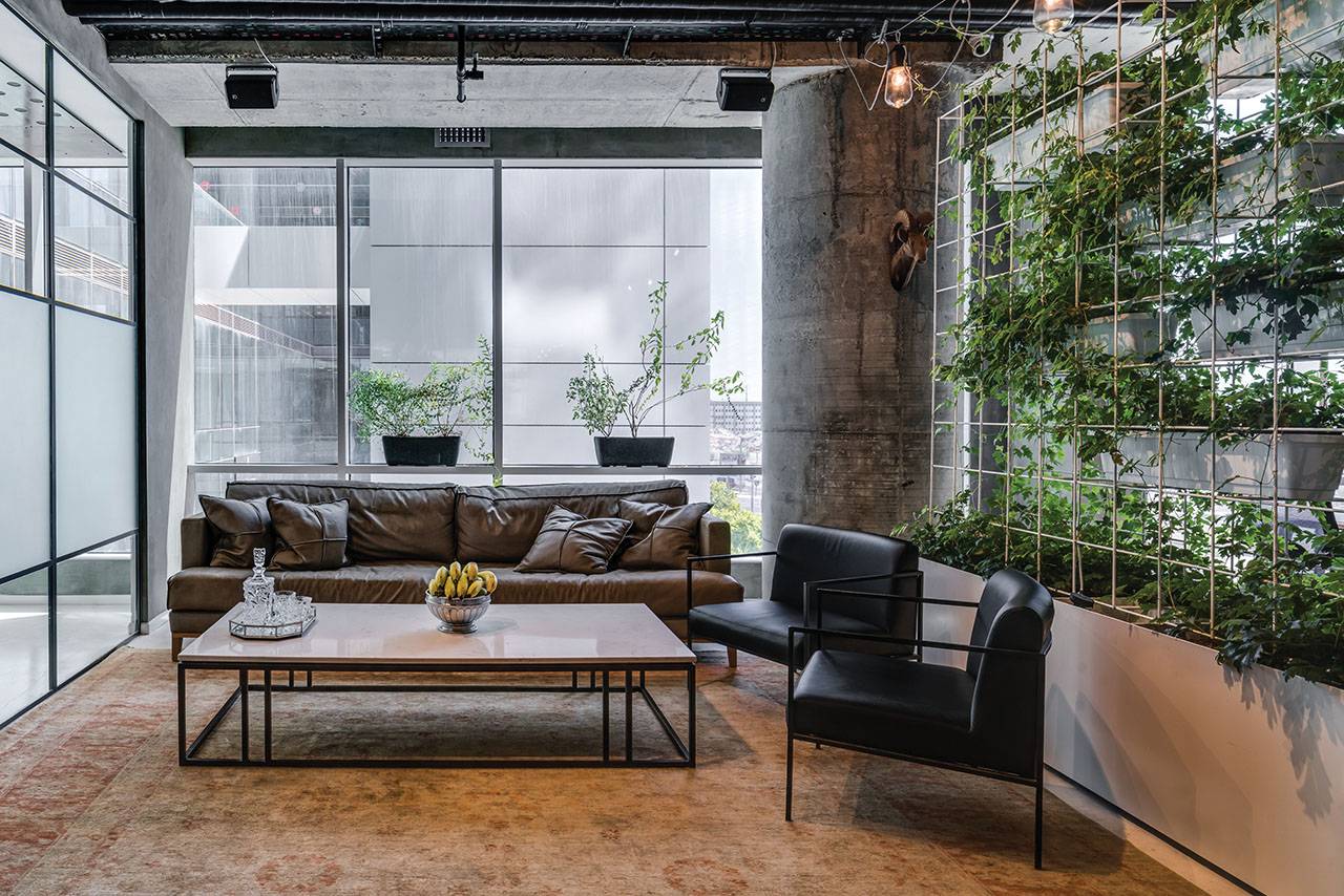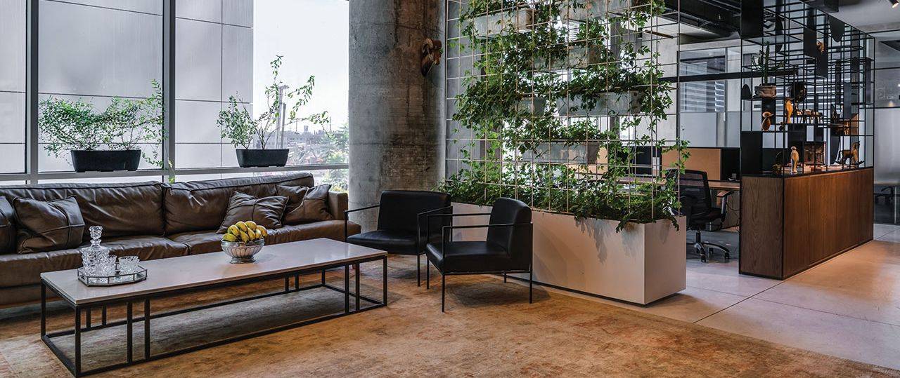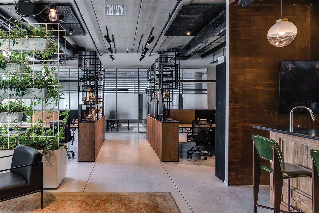 בין החלל הציבורי לאזור העובדים חוצצת צמחייה בשילוב קונסטרוקציית יציקת ברזל עגול, שאליה רותכו רשתות שמייצרות מעין כלוב המכיל אדניות לצמחיה טבעית. כך, בכל רחבי המשרד נשמרים קשרי עין בין החללים השונים, ובה בעת כל חלל נהנה מהפרטיות שנדרשת לו.