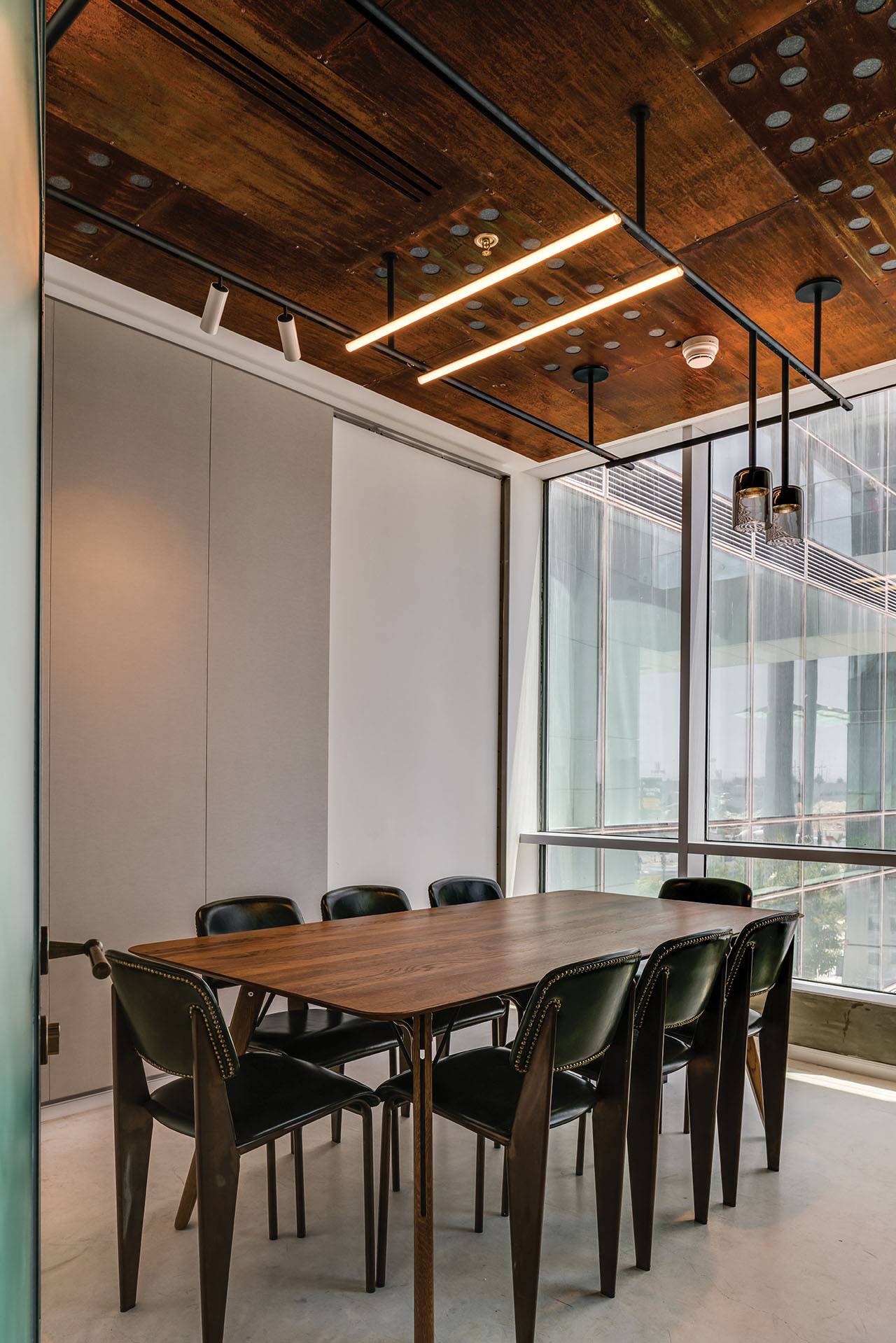 החלוקה הפנימית כמעט ואינה כוללת סגירות גבס, ונשענת בעיקר על מחיצות פתוחות ואווריריות, רובן ככולן עשויות מחומרים שלקוחים מתעשיית הבנייה, כמו ברזל יציקה, עץ מסוגים שונים, טרנסמיסיה (סוג של מתכת דחוסה), פח שעבר תהליכי חימצון ועוד. התקרות בחללים השונים חופו באריחים שחוררו בעזרת CNC, ובחלקם הפנימי הם חופו בצמר סלעים עבור האקוסטיקה.
