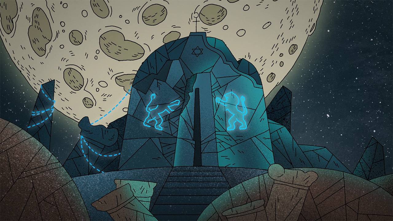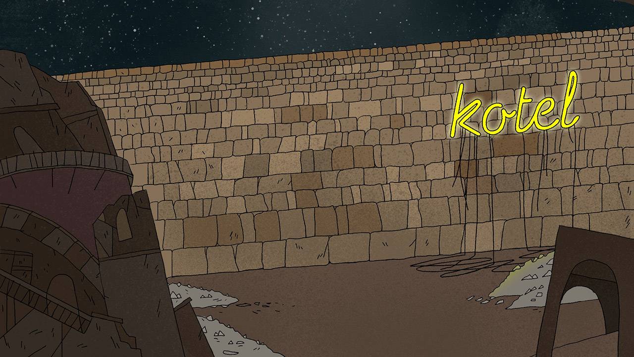 הסצנה השניה היא שרואים את המקדש מרחוק. זו היתה סצנה ממש קשה לכתיבה כי רצינו שהרב יזרוק את הקסדה ולא ידענו למה. ואז תום קוריס, האפטריסט שהוא גם אנימטור נפלא בפני עצמו, הציע שנעשה את המקדש קיטשי. וזה היה מדוייק. רק אחר גיליתי כמה הרעיון של קיטש וקדושה ופוסט אפוקליפסה הולכים יחד. איך עיצובי נאון חדרו גם לבתי כנסת בשילוב גרוטסקי שאנשים מקבלים כלגיטימי