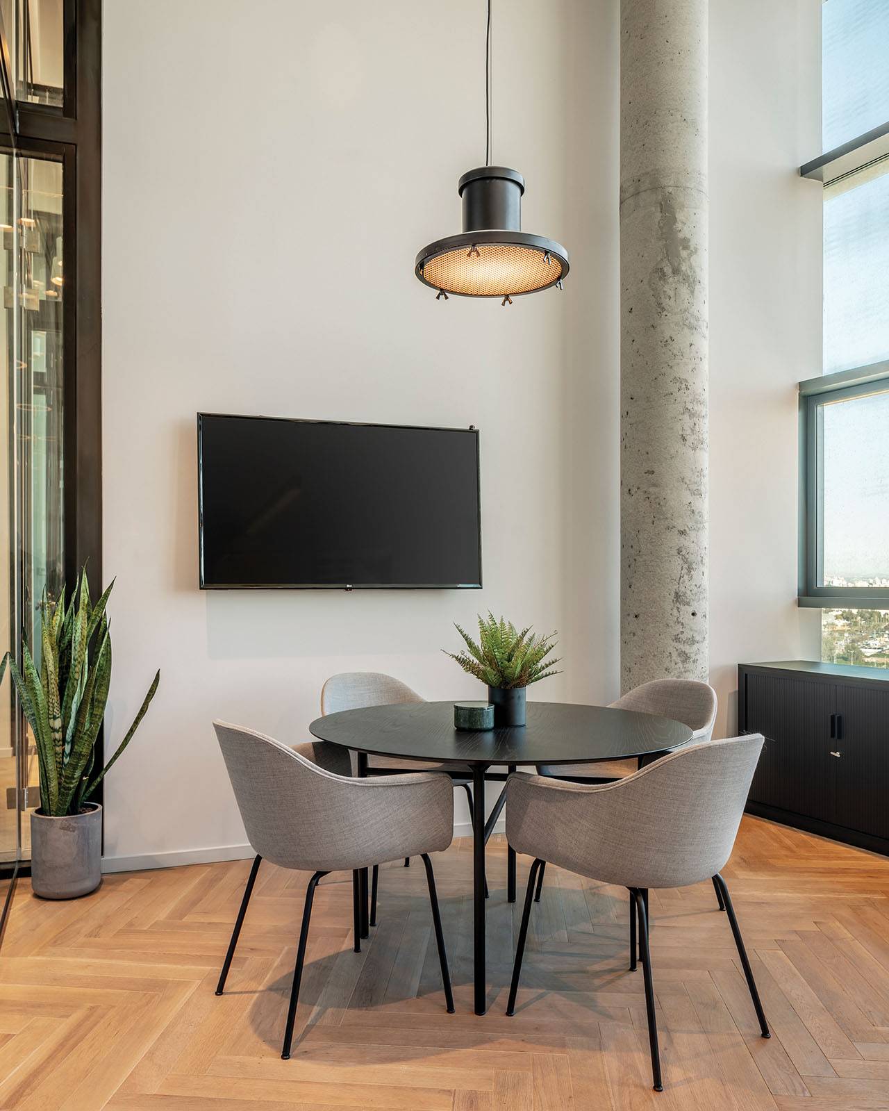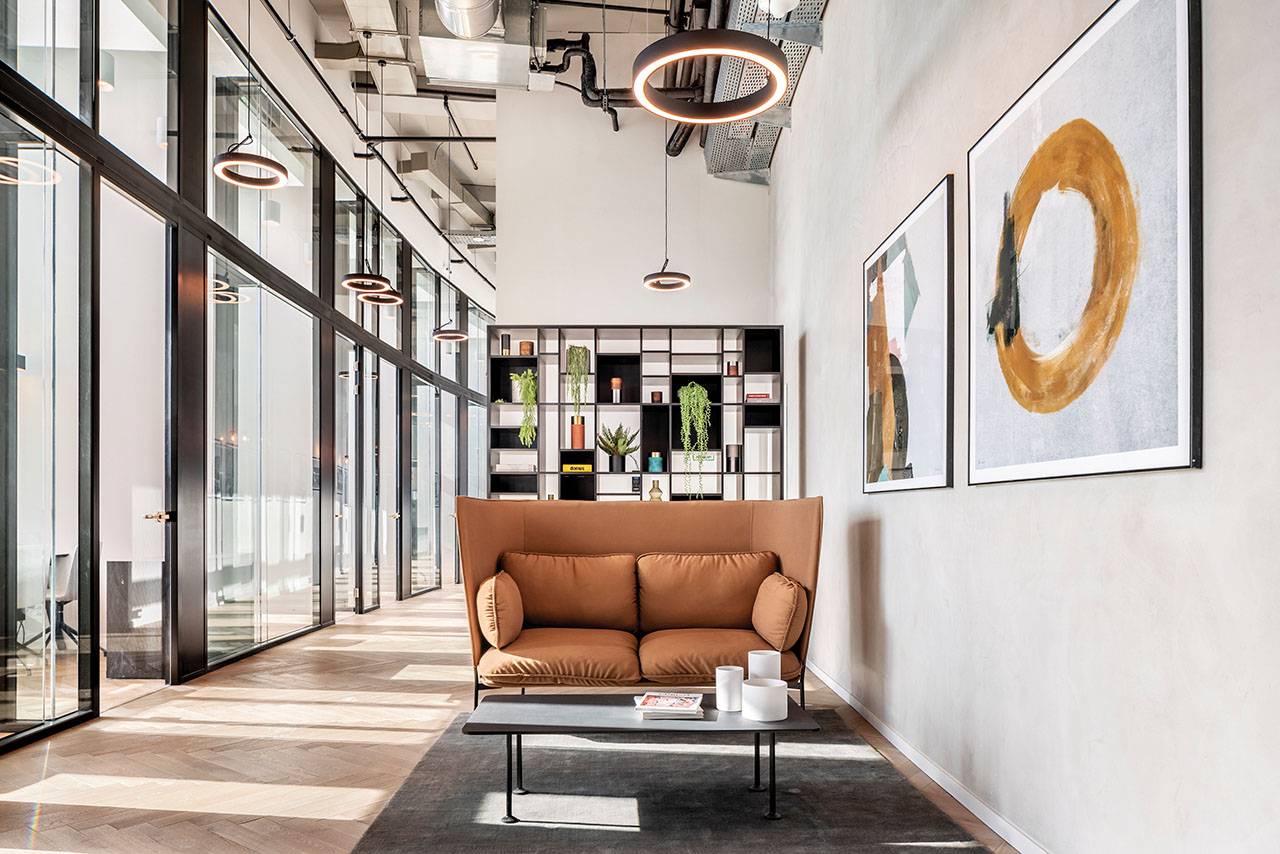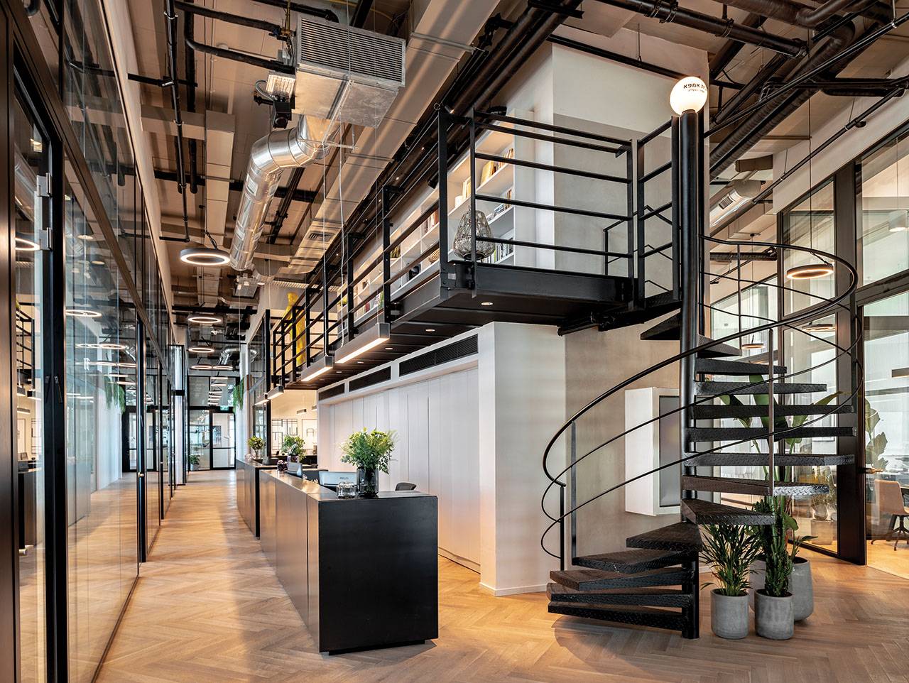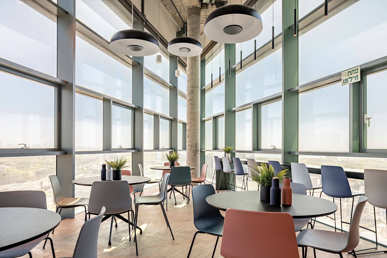לצד אלמנטים תעשייתיים ומערכות חשופות ששולבו בתקרתו הגבוהה של החלל (שישה מטרים) שולבו אלמנטים על־זמניים, דוגמת קומפוזיציות שונות של מסגרות קרניז דקורטיביות המעטרות את חלל הכניסה ולובי המעליות ומייצרות מראה קלאסי. במעברים המקיפים את גרעין הבניין הותקנו גופי תאורה במקצב משתנה, המקנה תחושה של תנועה ודינמיות, וברחבי החלל מוקמו פינות ישיבה מגוונות.