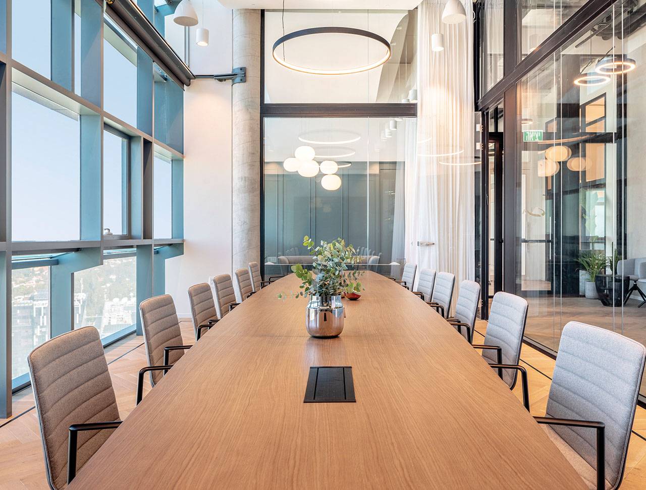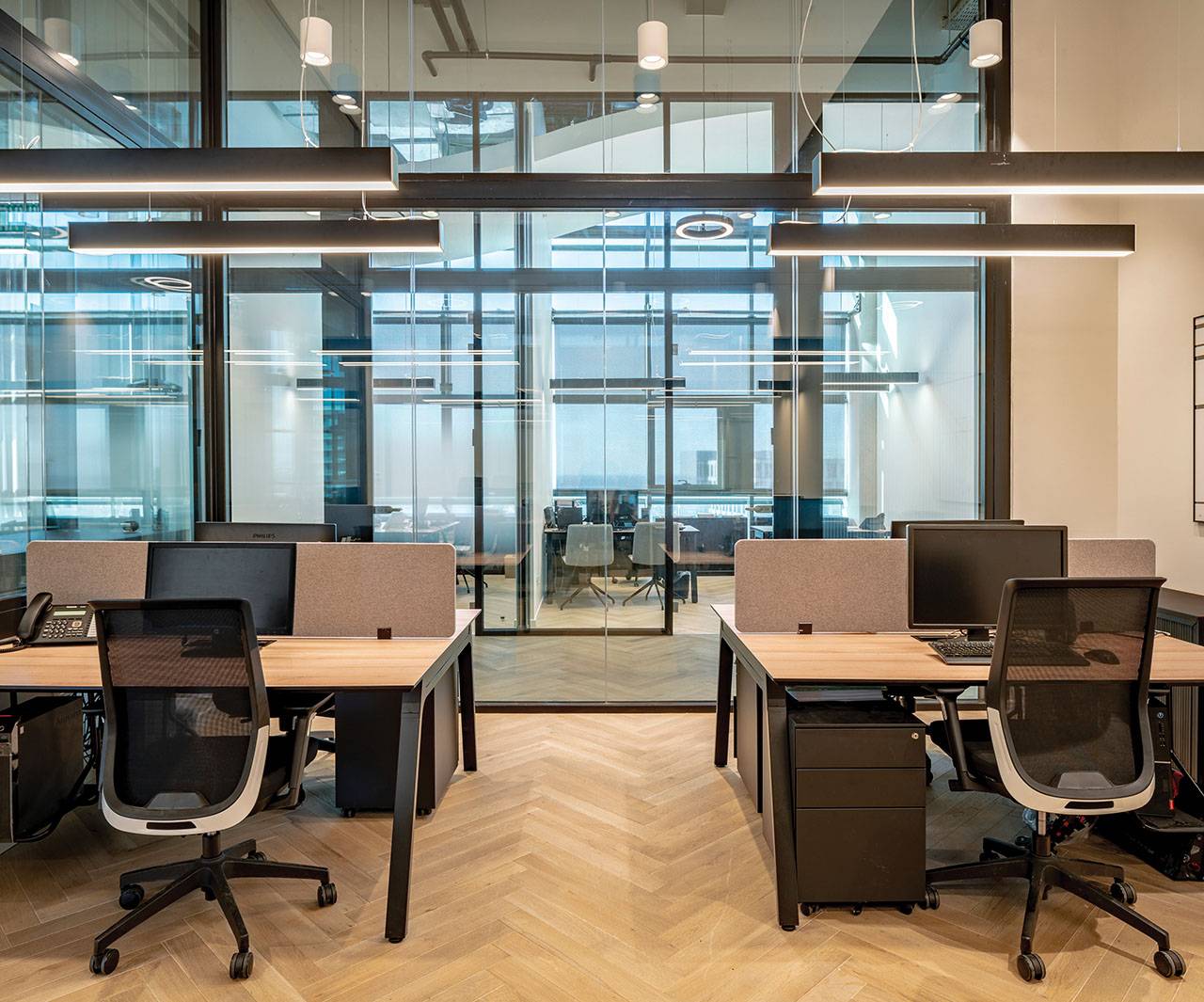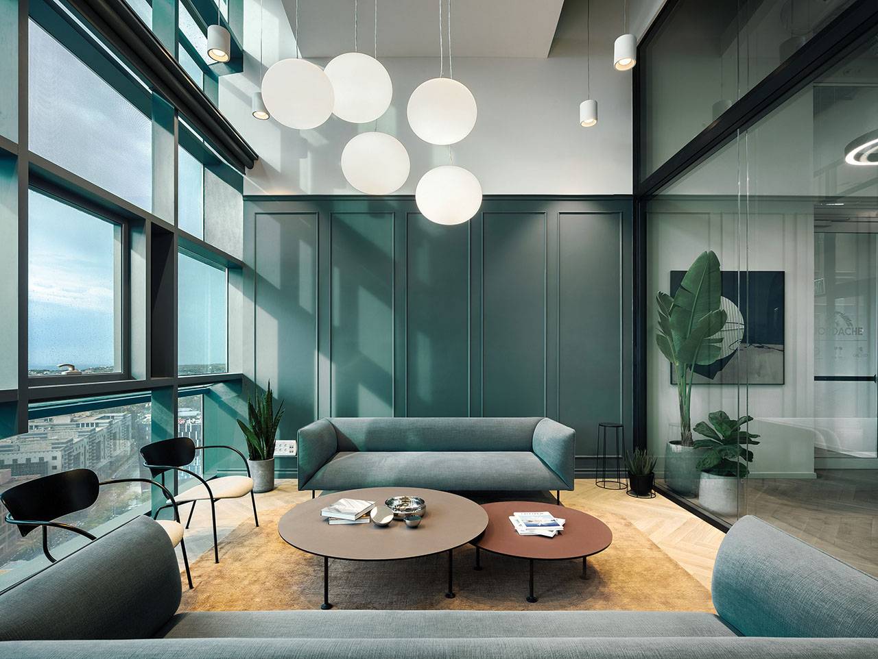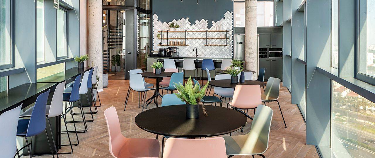 לצד אלמנטים תעשייתיים ומערכות חשופות ששולבו בתקרתו הגבוהה של החלל (שישה מטרים) שולבו אלמנטים על־זמניים, דוגמת קומפוזיציות שונות של מסגרות קרניז דקורטיביות המעטרות את חלל הכניסה ולובי המעליות ומייצרות מראה קלאסי. במעברים המקיפים את גרעין הבניין הותקנו גופי תאורה במקצב משתנה, המקנה תחושה של תנועה ודינמיות, וברחבי החלל מוקמו פינות ישיבה מגוונות.