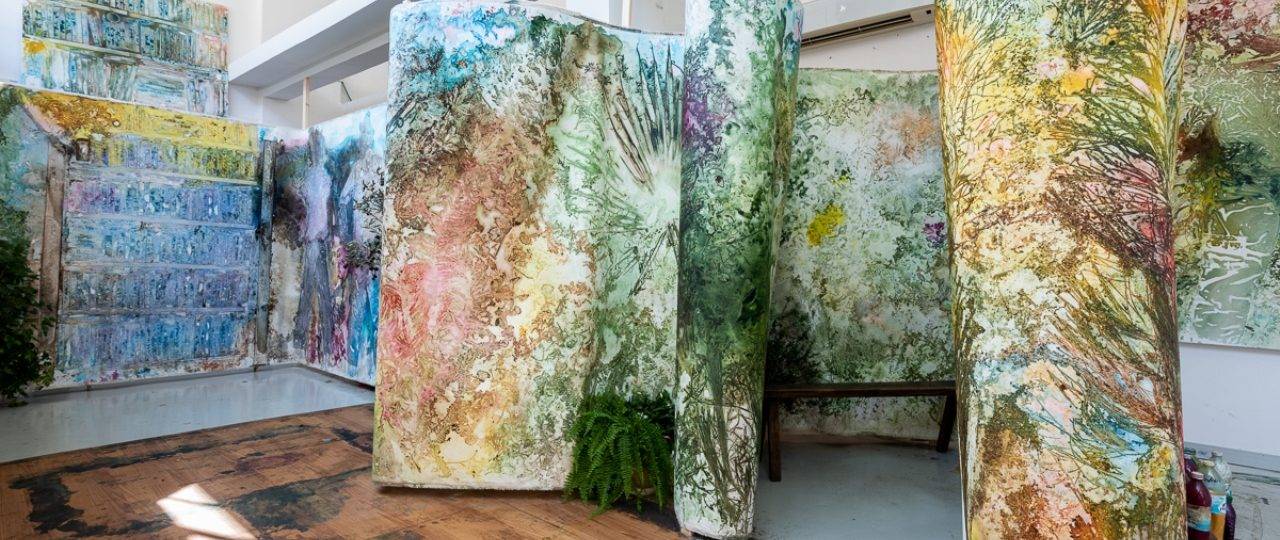 מי שנכנס בימים אלה לסטודיו של רתם רשף בקריית המלאכה מוצא את עצמו לפתע בעולם אחר: סבך של צמחיה חיה משתלב ברקע של בדי קנבס אינסופיים, שעוטפים את קירות הסטודיו ויוצרים סביבה מעוררת פליאה. זה מספר שנים שרשף מציירת על גבי בד שנמתח מגלילי קנבס המונחים על רצפת הסטודיו, מבלי לגזור את הבדים לפי מידות או למתוח אותם על מסגרת. בהמשך לכך התחילה להציג בתערוכות עבודות המורכבות מציורים המשכיים, בדים ארוכים שנתלים בחלל בכיוונים שונים, מגובה רב, ולעתים אף נשזרים זה בזה, בקומפוזיציות ההופכות את הציור לפיסול. הפעם, במיצב הכי אישי והכי טוטאלי שלה עד כה, תחת הכותרת ״אמאבאבת״, היא בחרה לעטוף את כל קירות הסטודיו מבפנים, וליצור סביבה גדושה, רב שכבתית, המדמה גן סתרים.
