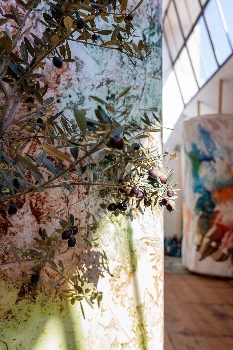 ״אפשר לומר שהסדרה ׳עדן (פרקים בתולדות הישוב)׳ יצרה חיבור בין המופשט לנרטיבי, אבל הצמחיה התחילה להיכנס במקביל לציורי ה׳הטבעות׳ על הקנבס. חומרים מלאכותיים שיצרו תעתוע אופטי של אורגניות ובהמשך גם המשיכה שלי להתנסות עם הטבעת צמחים אמיתיים בתוך הציורים. אני נעה רוב הזמן בתוך מרחב עירוני והצמחייה שאני אוספת ומביאה לסטודיו מגיעה ברוב המקרים משאריות של טבע, מהרצפה, משבילים וכבישים, במטרה לנצל את מה שיש ולהביא גלגול חיים נוסף למה שעבר זמנו.